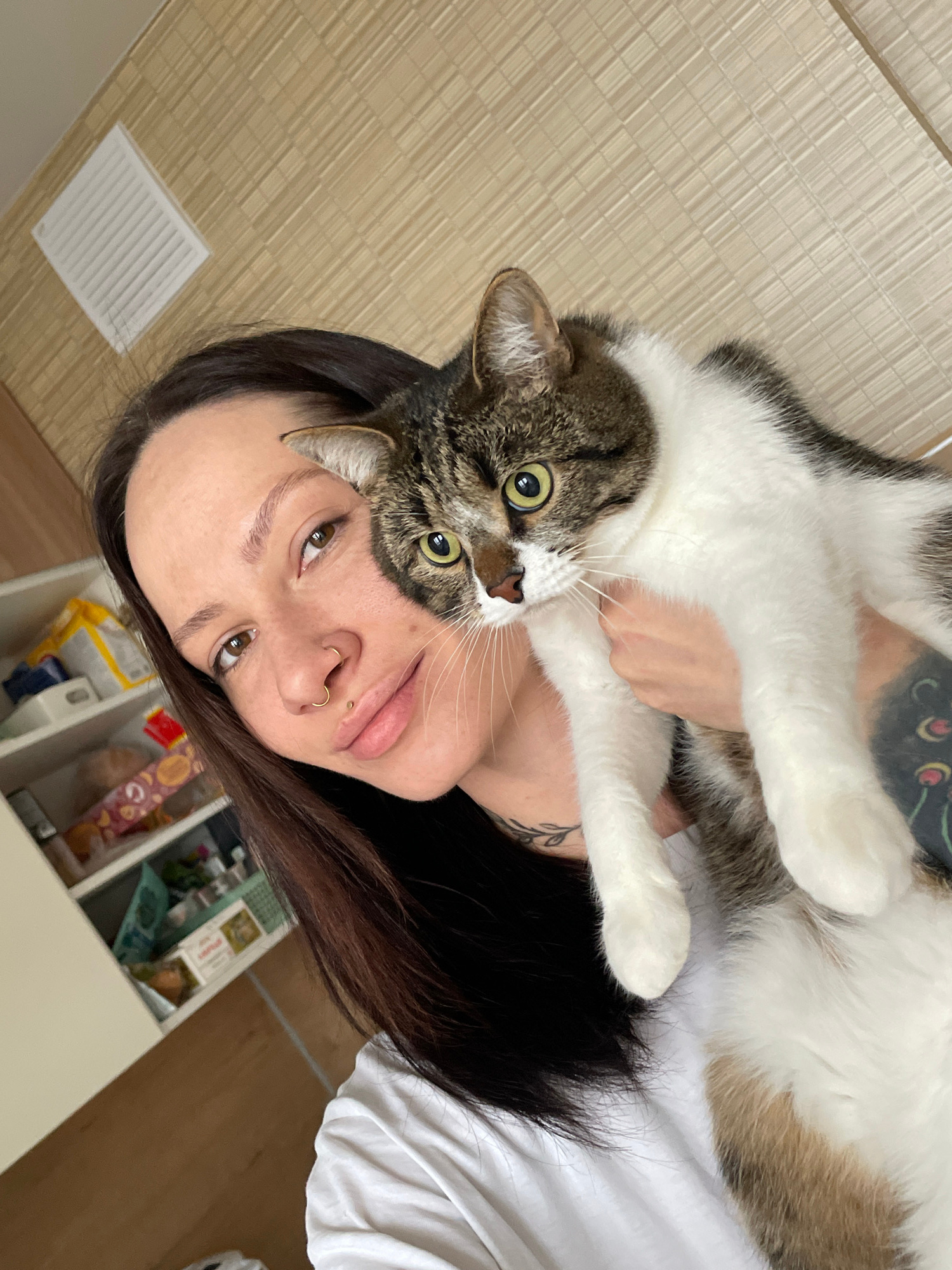 A person with dark hair is holding a cat. The cat is white with brown and black markings. The person has a nose ring and tattoos on their arm and neck. The background includes a light-colored wall, a…read more