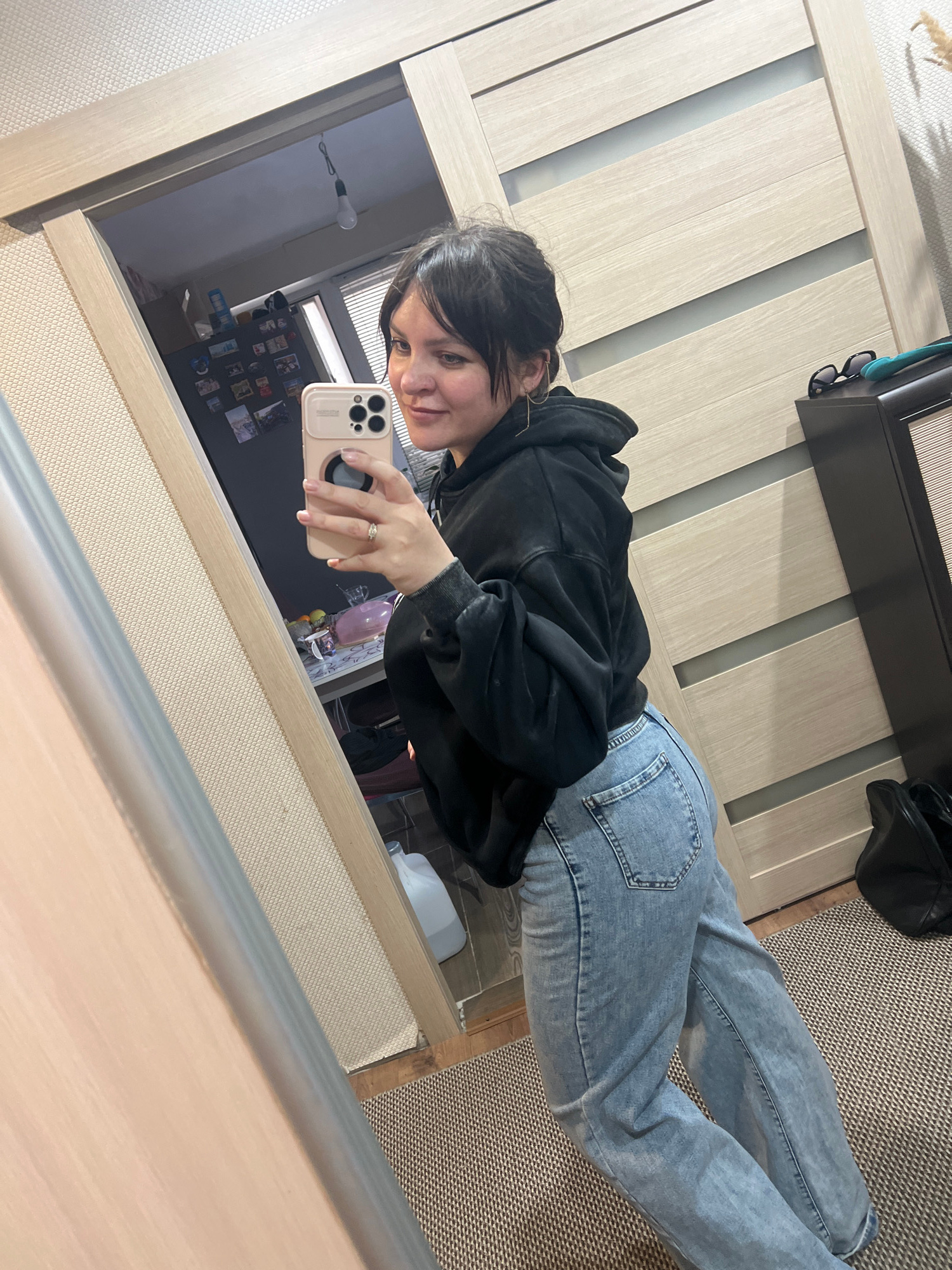 A person is taking a selfie in a mirror. The person is wearing a black hoodie and light blue jeans. A ring is visible on their left ring finger. The reflection in the mirror reveals a kitchen with a r…read more