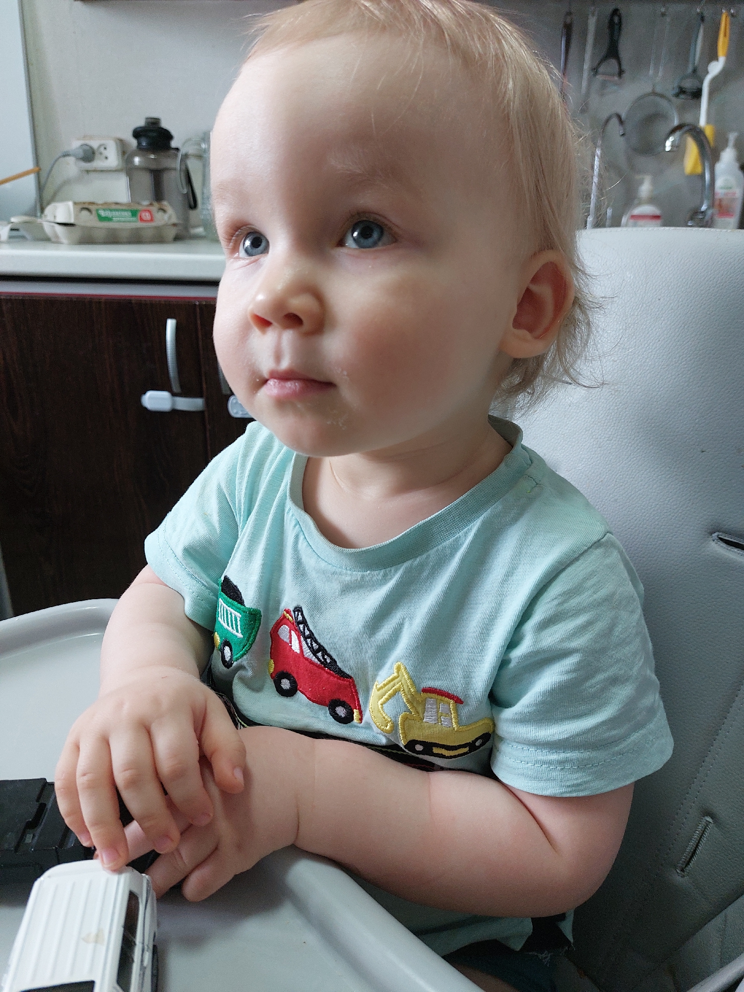 A fair-skinned, light-haired toddler wearing a light blue t-shirt with car graphics is sitting in a high chair. The child has food residue around their mouth. The child's hands are clasped together, a…read more