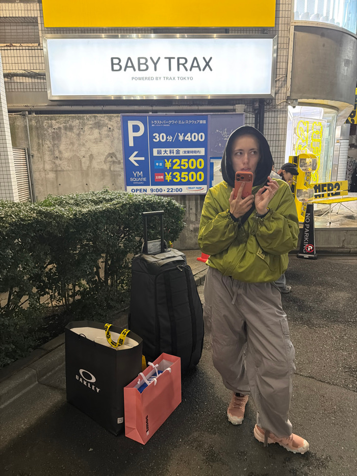 A female-presenting individual stands on a city sidewalk in Jingumae, Shibuya-ku, Tokyo, Japan, at night or dusk. She is positioned slightly right of center, wearing a light green hooded jacket, light gray cargo pants, and light pink athletic shoes. Her hood is up, framing her face, which is turned slightly to the left with a neutral expression. She holds a red smartphone with both hands, positioned in front of her torso. To her left, a black wheeled duffel bag with an extended handle stands upright. In front of the duffel bag are two shopping bags: a large black Oakley bag with a yellow strap visible inside, and a smaller pink Atmos bag. Behind her, a dense green hedge lines a concrete building facade. Above the hedge, a blue rectangular parking sign indicates "P" with a left arrow, "トラストパーク・エイム・スクエア原宿" (Trust Park Aims Square Harajuku), parking rates (30 min/¥400), daily maximum rates (Weekday ¥2500, Saturday/Sunday/Holiday ¥3500), and operating hours (Open 9:00 - 22:00), along with "VM SQUARE". Above this, a large illuminated white sign with a yellow top border displays "BABY TRAX" and "POWERED BY TRAX TOKYO." To the far right, yellow architectural elements or art installations are partially visible, along with a partial "NO PARKING" sign and faint figures in the background. The ground is paved and appears damp. | Open Wire