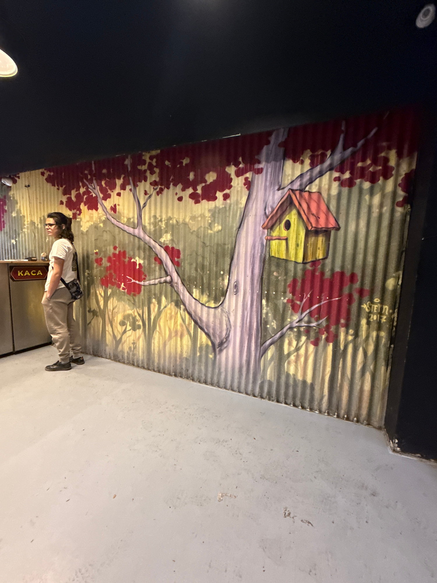 An indoor scene, likely in Stara Zagora, Bulgaria, depicts a man standing in front of a colorful wall mural. The man has long dark hair tied back, wears glasses, a white t-shirt, khaki pants, and dark…read more