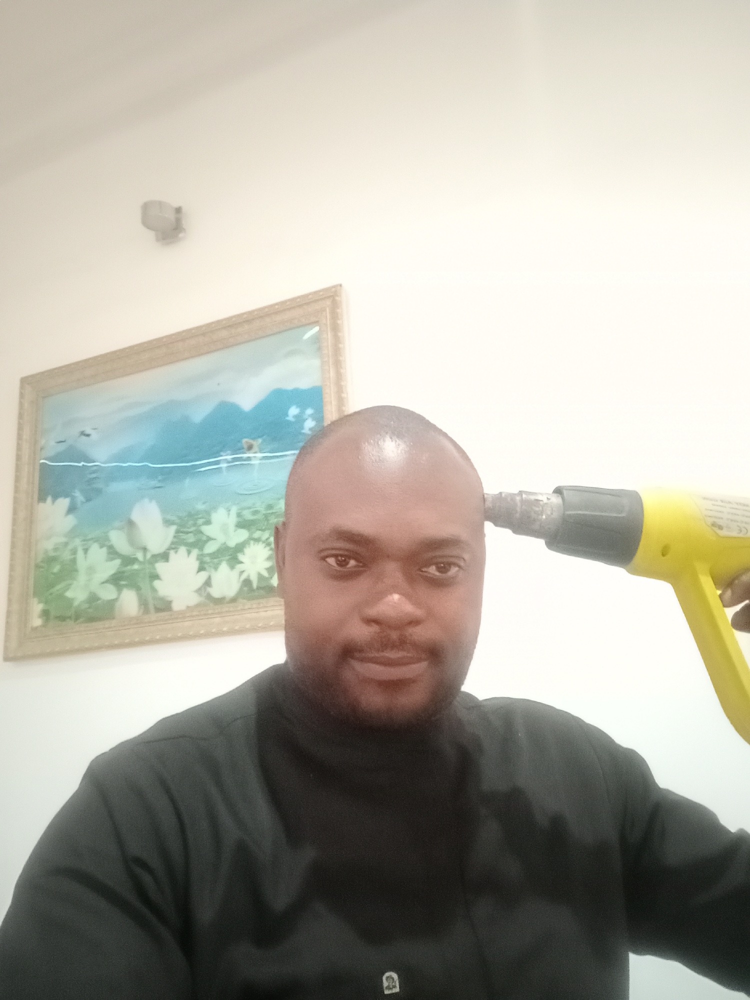 A close-up shot depicts a man with dark skin, a shaved head, and a black shirt with a small white logo on the lower front. He has a short beard and appears to be smiling slightly. A yellow heat gun is…read more