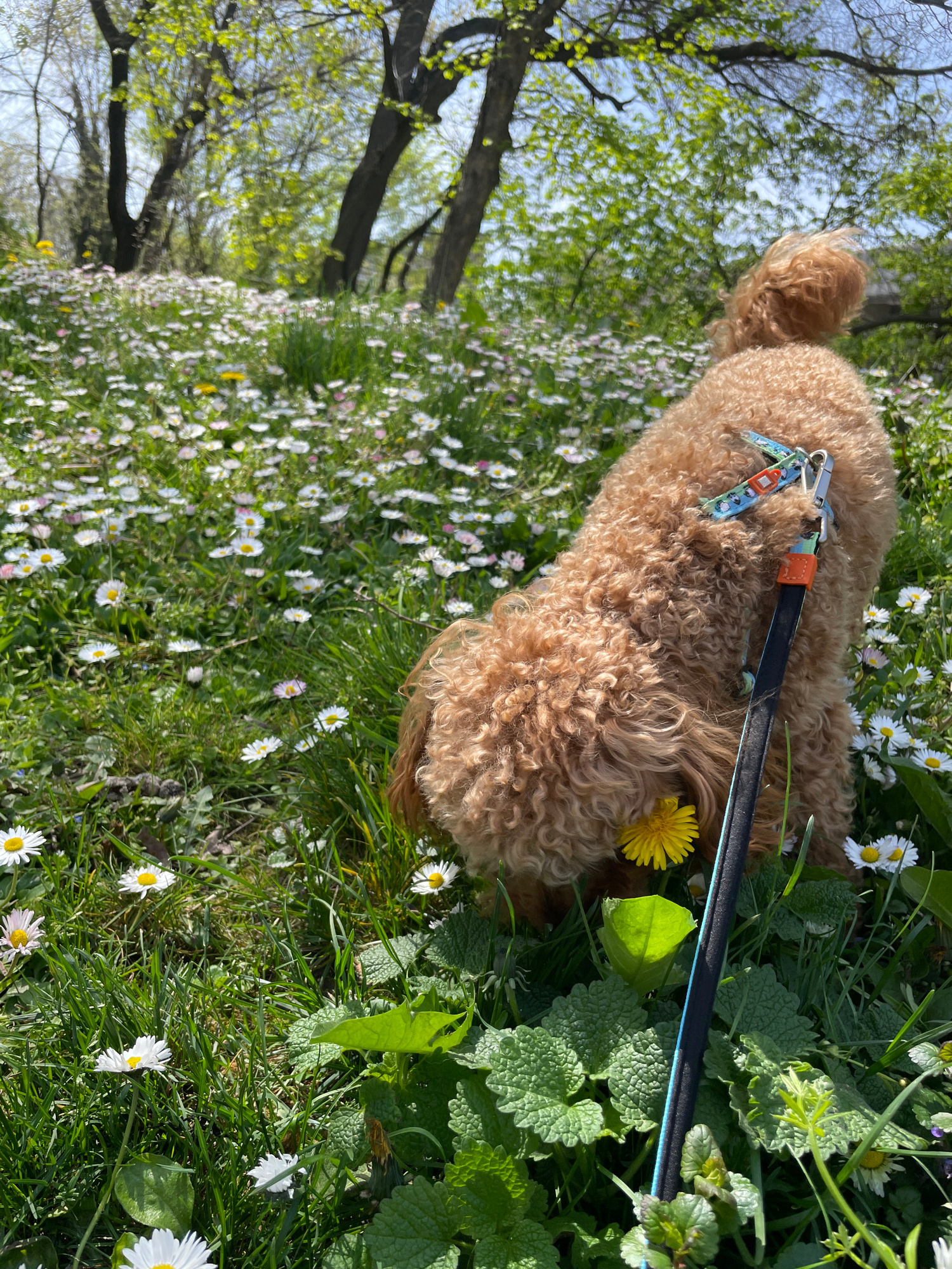 This image, captured in Plovdiv, Bulgaria, presents a top-down view of a light brown, curly-haired dog (resembling a poodle or doodle breed) positioned vertically in a lush field of grass and wildflow…read more