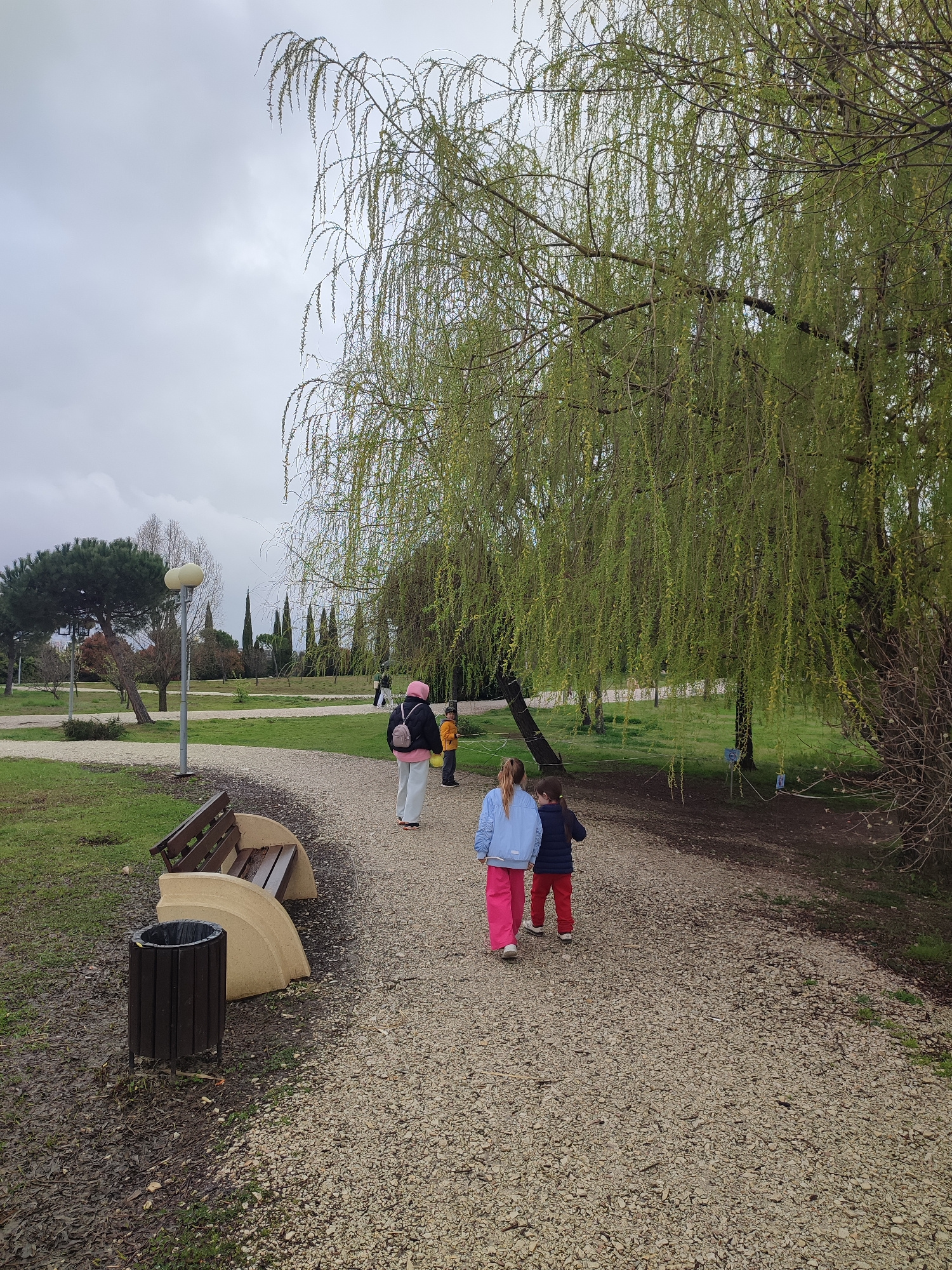 The image shows a park scene in Sochi, Russia, on an overcast day. In the foreground, two children, a girl in a light blue jacket and pink pants, and a boy in a navy jacket and red pants, are walking…read more