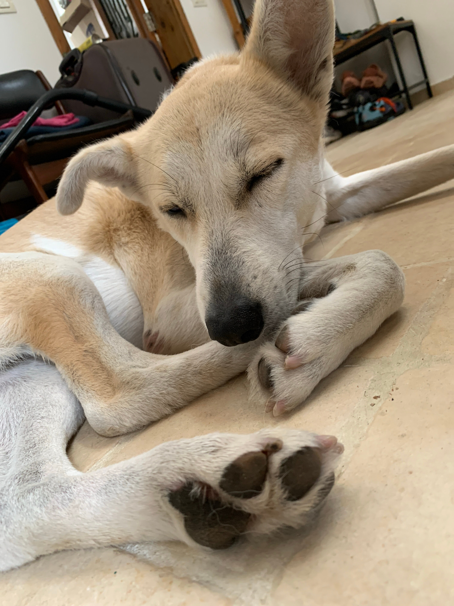 A light-colored dog with closed eyes is lying on a tiled floor. The dog's left paw is prominently visible with dark-colored toe pads. The dog's head is resting on its other front leg. A chair, shelvesβ¦read more