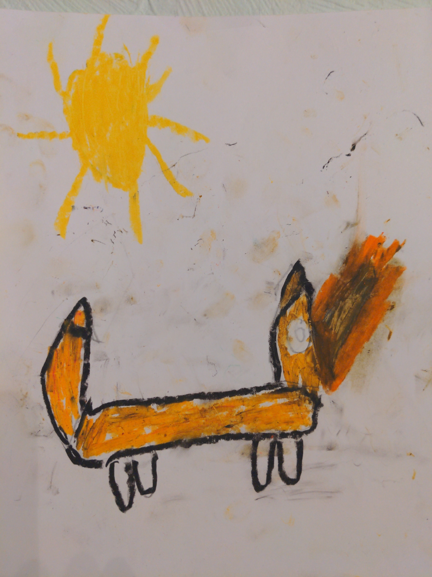 A child's drawing on white paper features an abstract representation of a person's head or face, rendered primarily in yellow and orange crayon. The face is angular and stylized, with a tuft of brown…read more