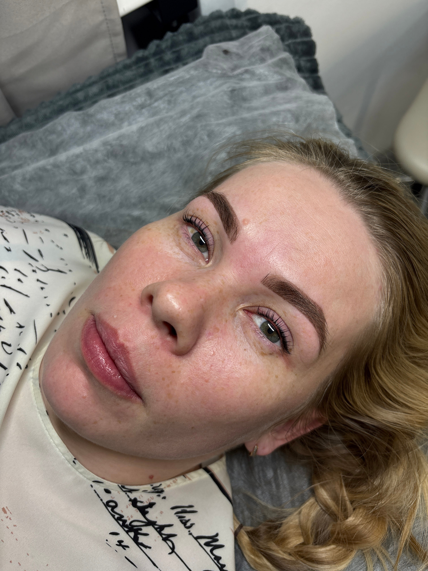 A fair-skinned woman with freckles is lying on a gray, textured surface, possibly a pillow or cushioned table, in what appears to be an indoor setting. Her blonde hair is pulled back, revealing her fa…read more