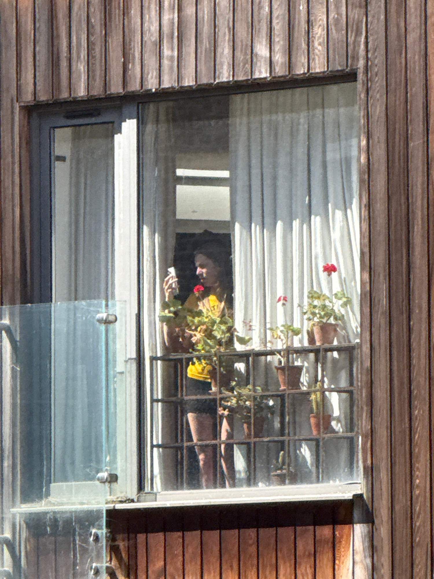 Captured through a window, a person wearing a black hat and a yellow garment is observed inside a building. The window has a metal grid and potted plants with red flowers are placed on the outside of…read more