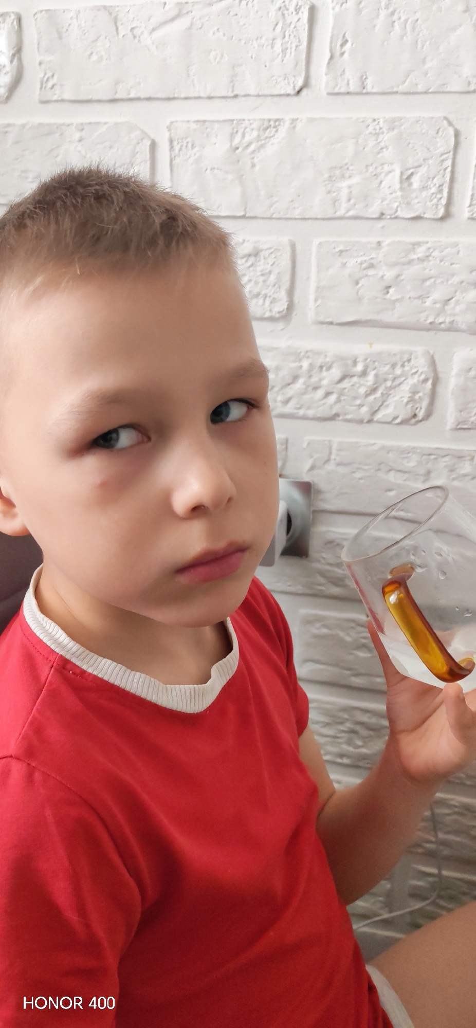 A young boy with light brown hair and blue eyes is holding a clear glass with an amber-colored handle. He is wearing a red t-shirt with a white trim. He is looking directly at the camera with a slight…read more
