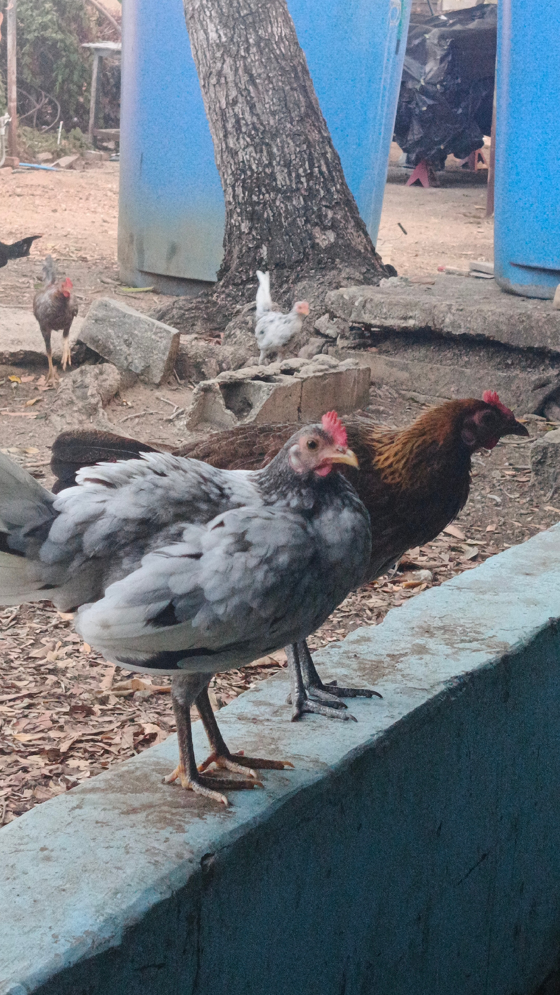 The photograph shows a group of chickens in an outdoor setting. In the foreground, two chickens stand on a low, concrete wall. The chicken in front has gray and white plumage, while the one behind it…read more
