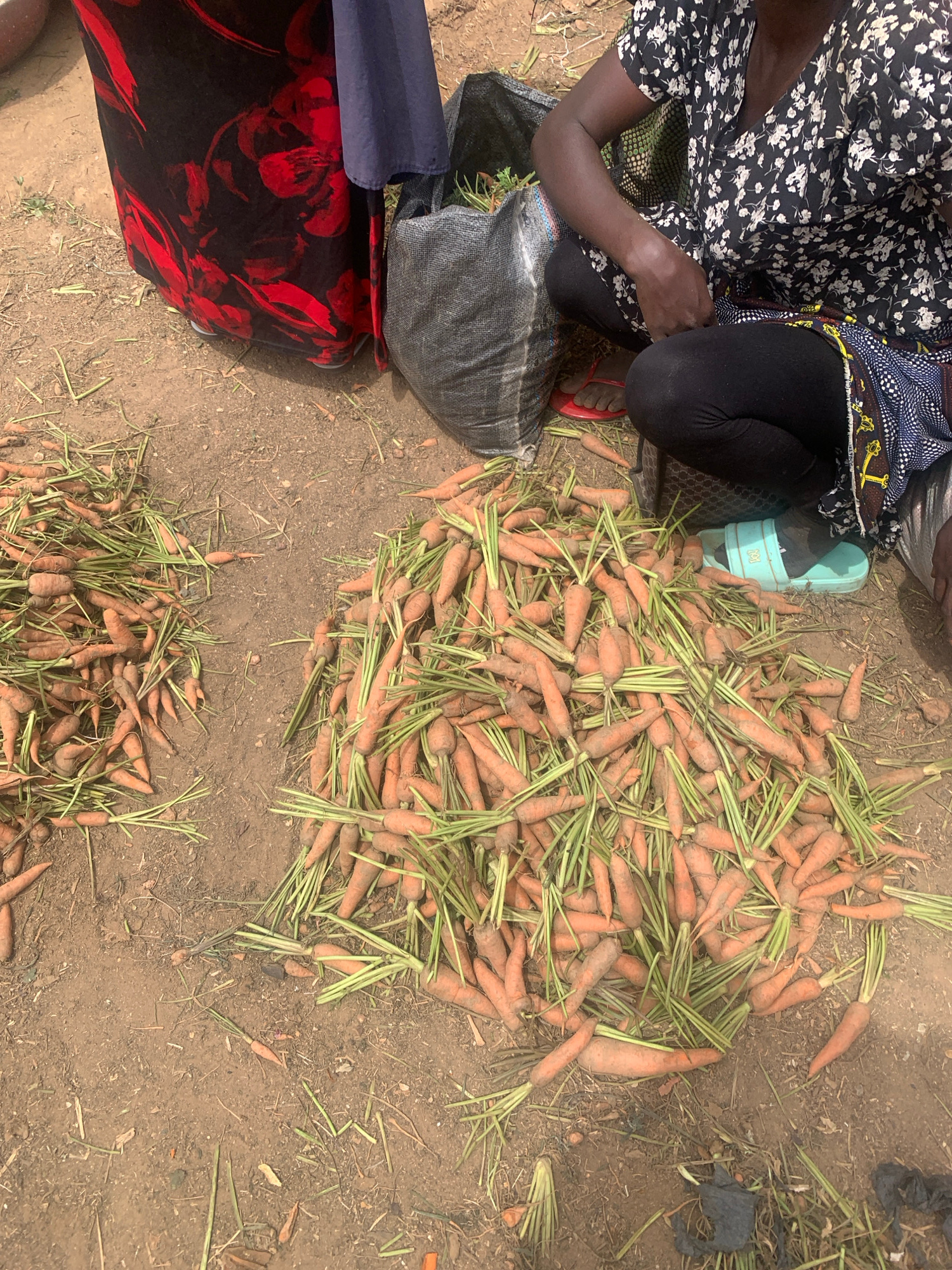 A person wearing a floral dress and black leggings sits on the ground near a pile of carrots with green tops. A second, smaller pile of carrots is located below. To the left is a red floral patterned…read more