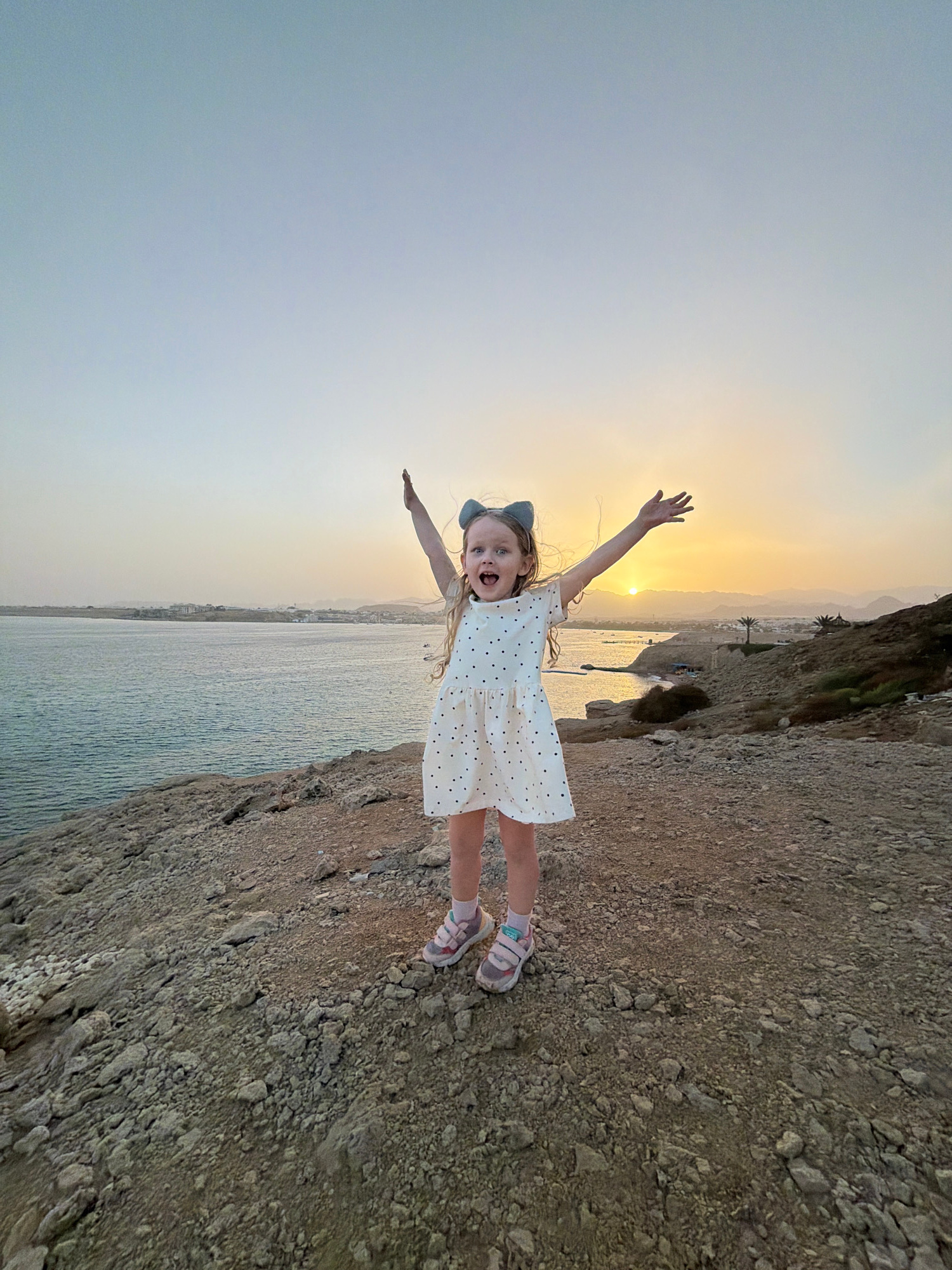 A child stands on a rocky outcrop with her arms outstretched, appearing to be flying. She is wearing a white dress with black polka dots and pink sandals. The backdrop features a body of water and the…read more