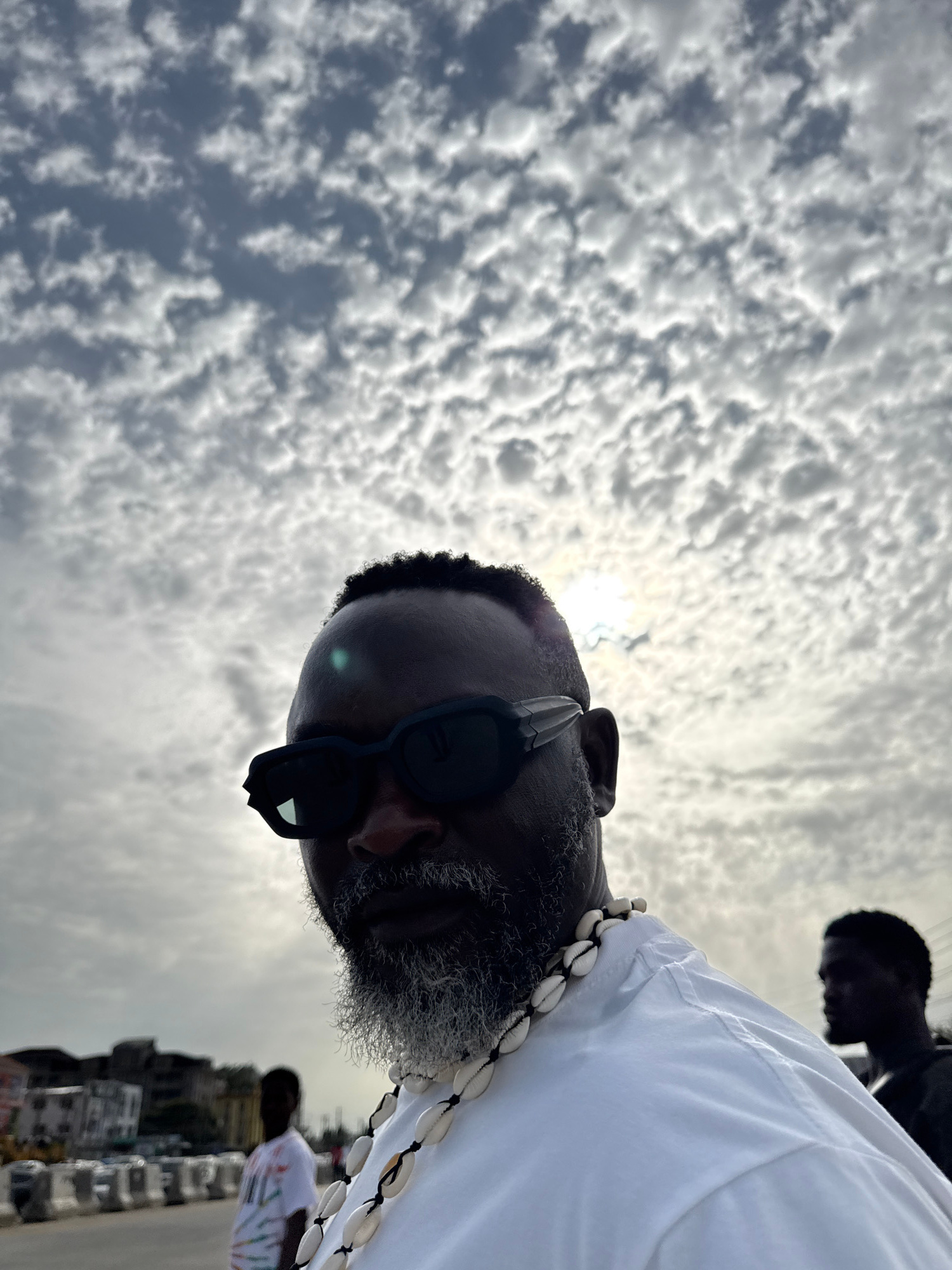 The image shows a man with a grey beard and sunglasses, wearing a white shirt and a necklace made of seashells, facing the camera in an outdoor setting. Part of another person is visible behind him. T…read more