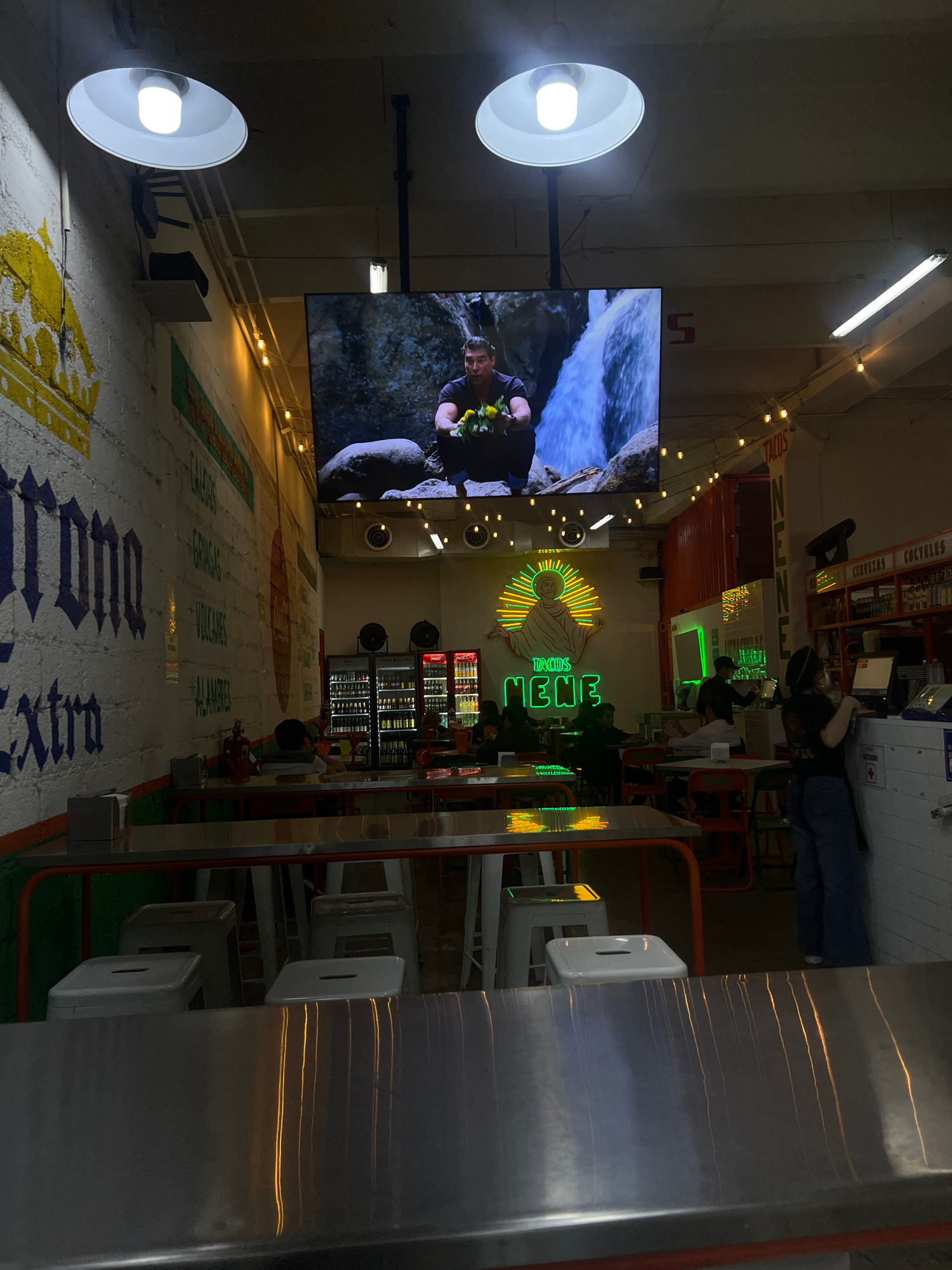 This image captures the interior of a vibrant and casual restaurant or bar, likely in Mexico City. The scene is illuminated by a mix of artificial lights, including bright white task lamps, overhead f…read more