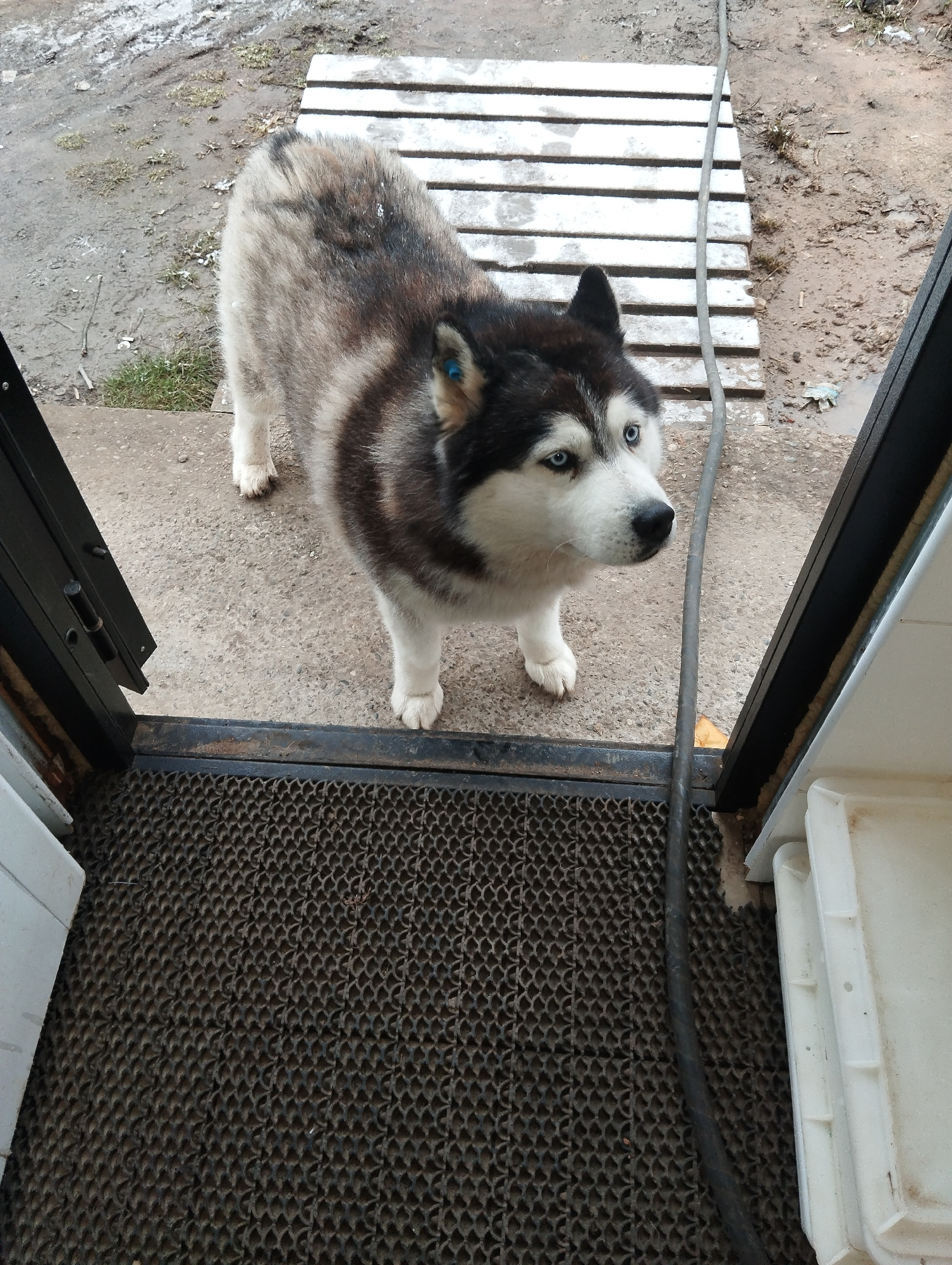 A husky dog with blue eyes stands on a concrete surface in front of a wooden pallet, viewed from inside a doorway. The doorway leads to a dark, textured mat. Outside the doorway, the ground appears to…read more