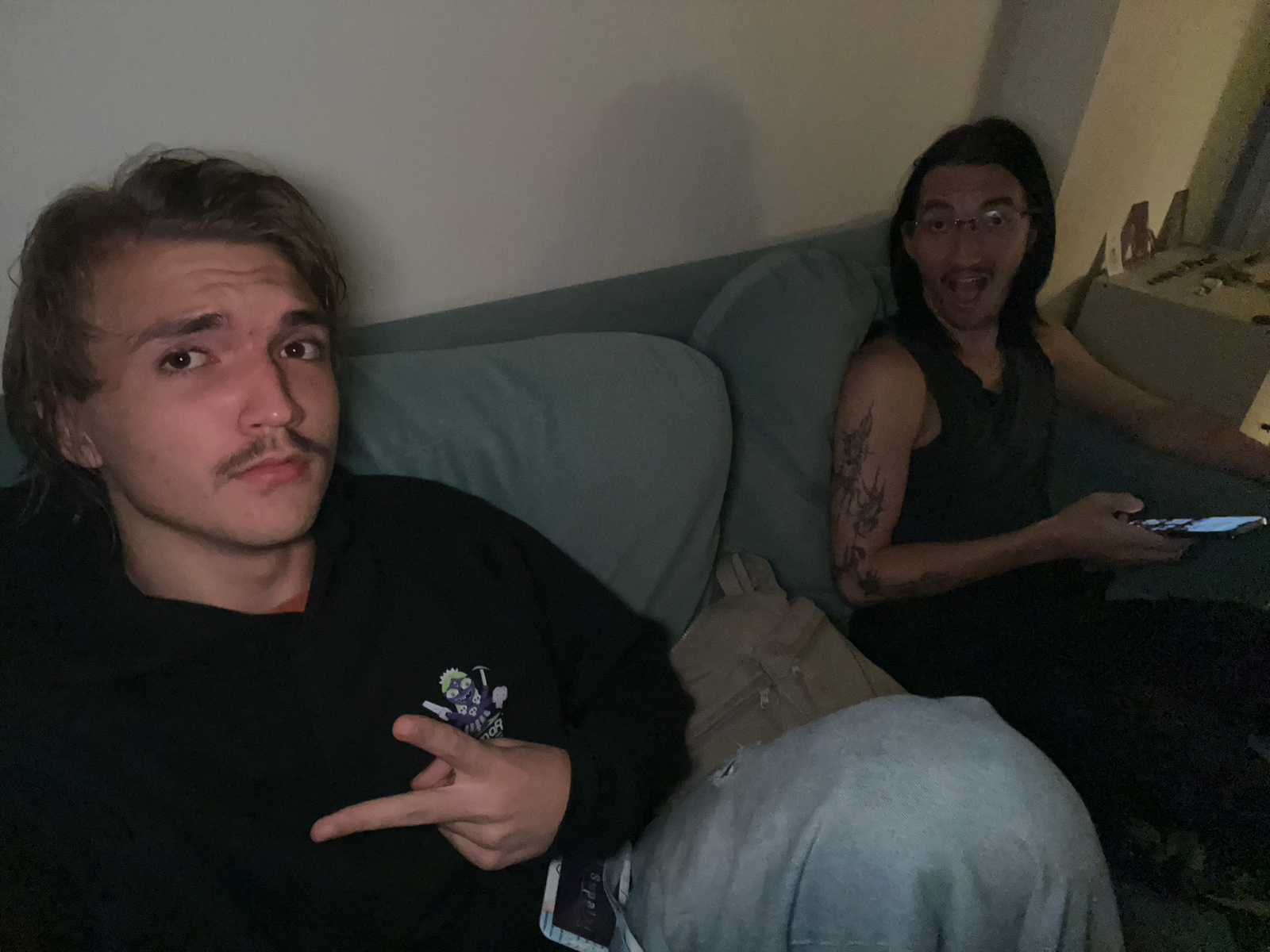 Two adult males are depicted seated on a light blue-green upholstered sofa in an interior setting within Samrong Nuea Subdistrict Municipality, Thailand. The male on the left has light brown hair and…read more