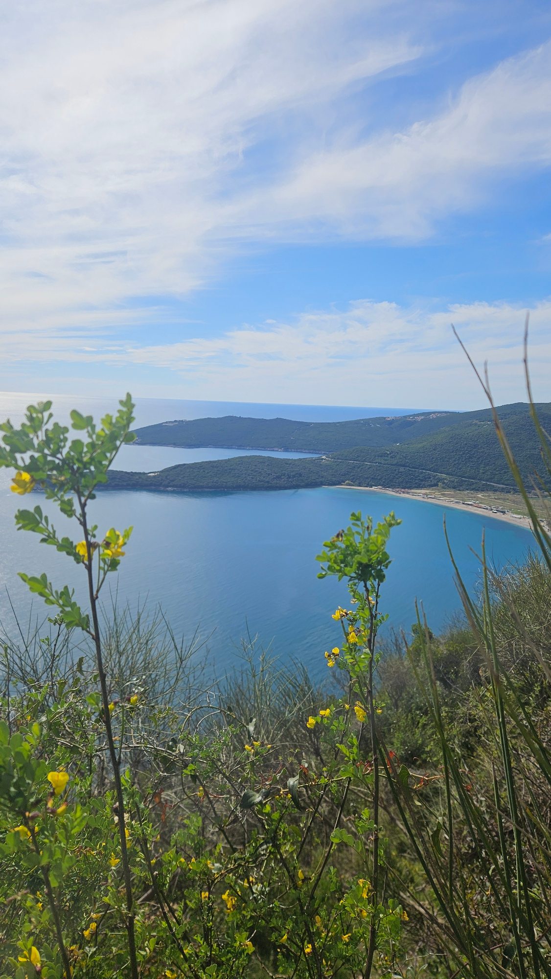 A scenic, rotated view captures a shoreline against a blue sky with scattered clouds. The image seems to have been taken from a viewpoint on a hill overlooking the coast. The location is likely near…read more