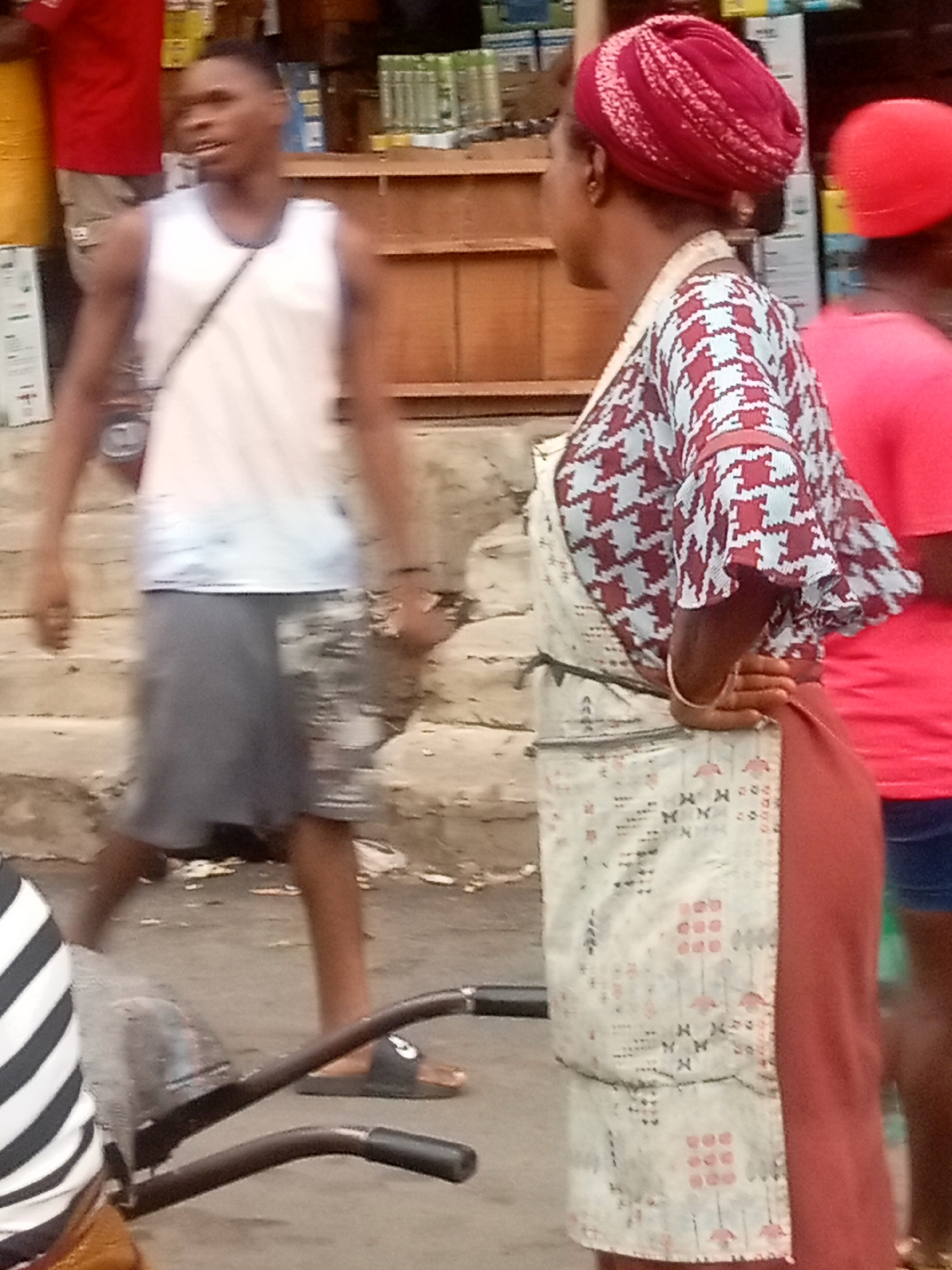 In Fegge, Nigeria, an outdoor scene presents several individuals and objects. A woman, wearing a maroon headwrap, a houndstooth-patterned blouse, and an apron, stands with her hands on her hips. To he…read more