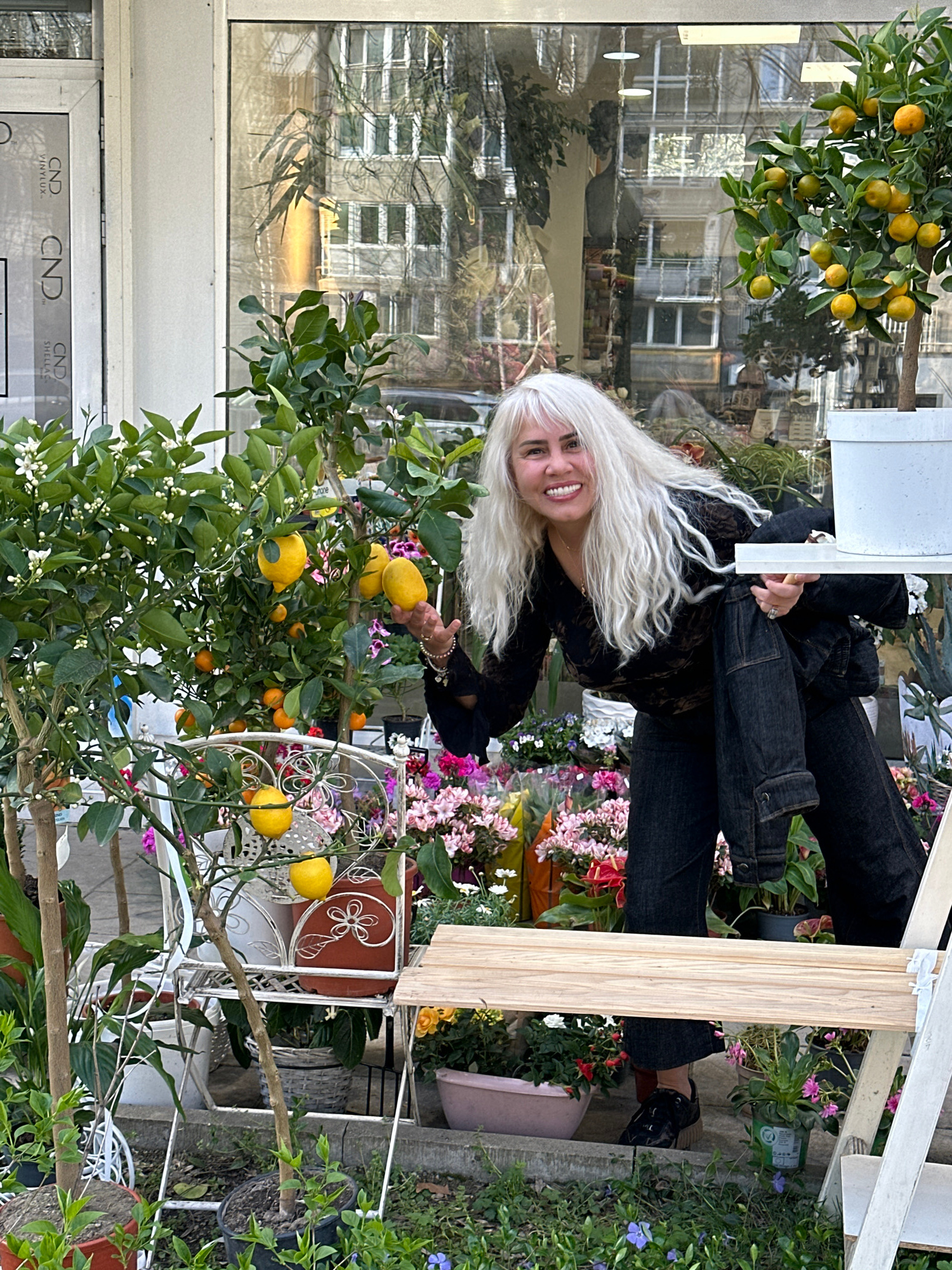 A vertical shot reveals a smiling woman with platinum blonde hair positioned near a citrus tree, presumably in Sofia, Bulgaria. The woman is wearing black clothing and standing beside a citrus tree la…read more