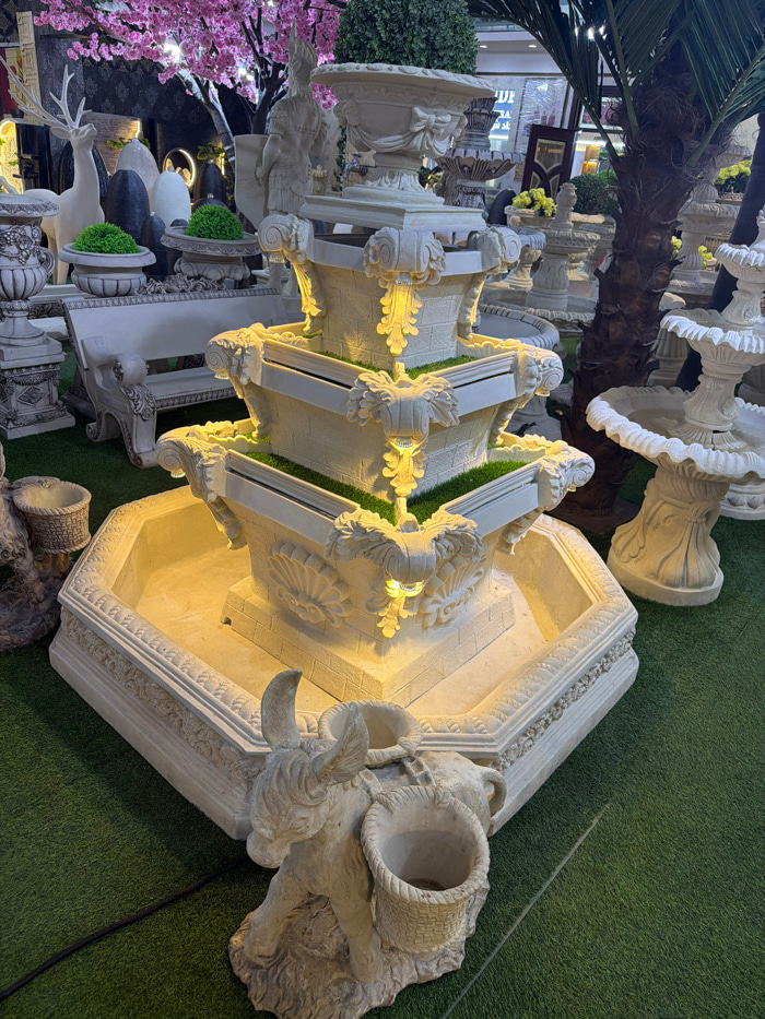 A three-tiered fountain with a goat head spilling into the bottom basin is the focal point. The fountain features intricate decorative details, including floral carvings and ornate edges. It's surroun…read more