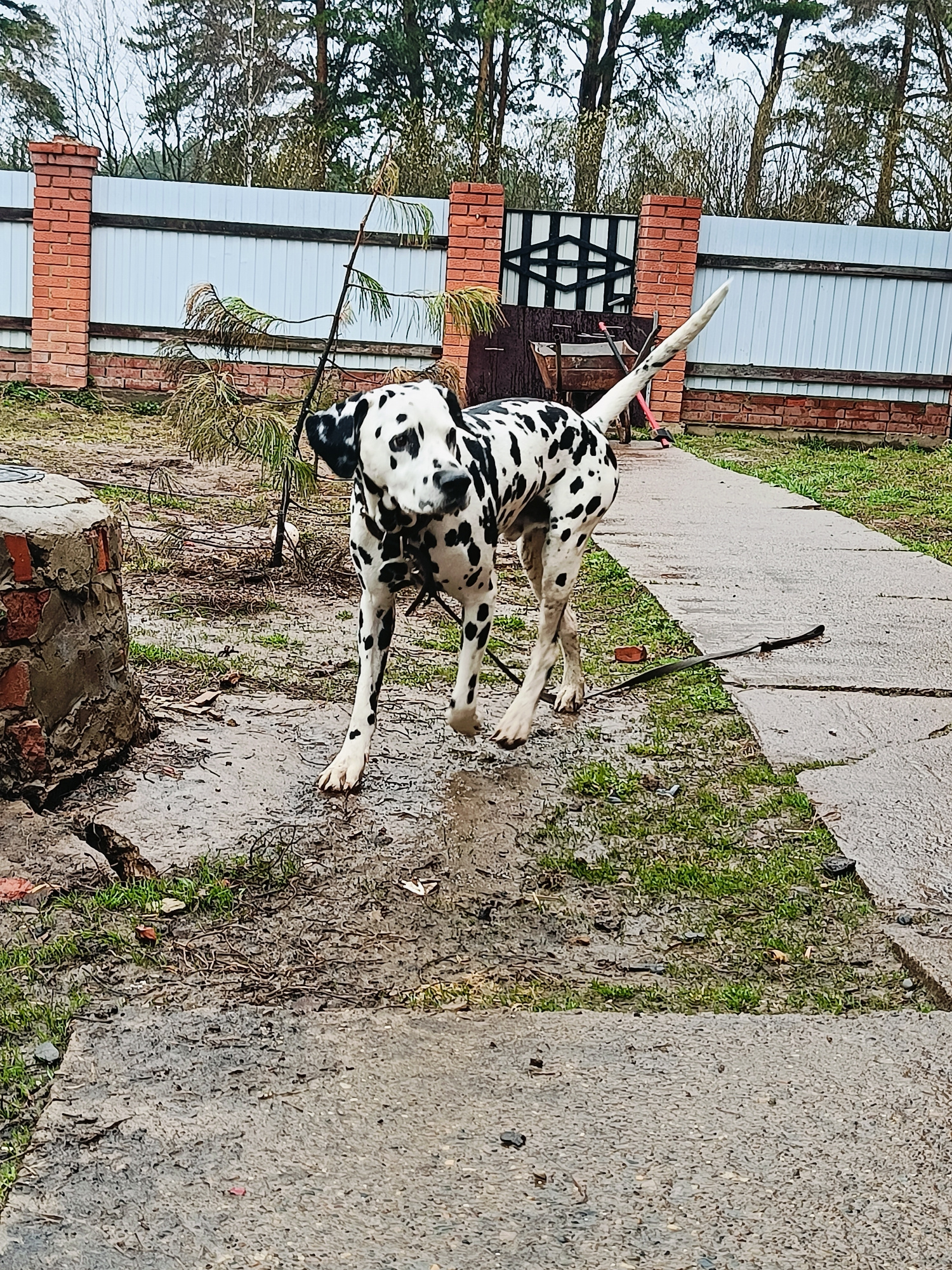 A black and white Dalmatian dog, with distinct spots, stands on a wet, unpaved pathway in an outdoor setting. The dog is positioned in the foreground, facing slightly towards the viewer with its head…read more