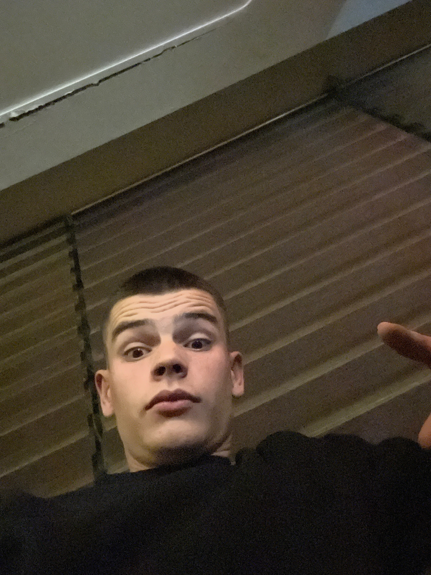 A close-up, slightly angled shot shows a young man with short hair, fair skin, and brown eyes. He is looking directly at the camera. Part of his right hand is visible in the upper right corner of the…read more