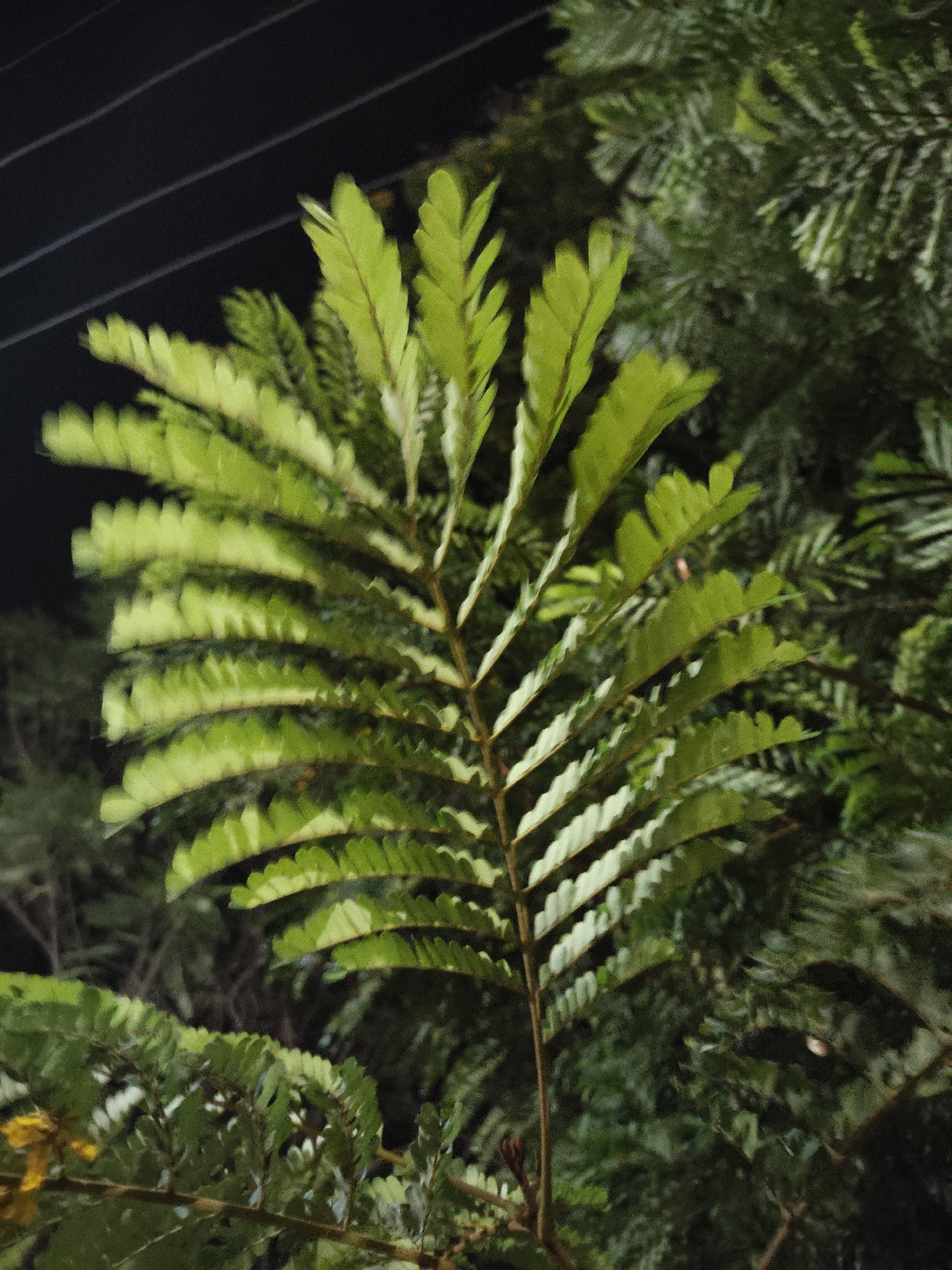 The image shows a branch of a tree with small, green leaves arranged in pairs along the stem. The background is out of focus, revealing other trees and dark areas possibly indicative of night. The loc…read more