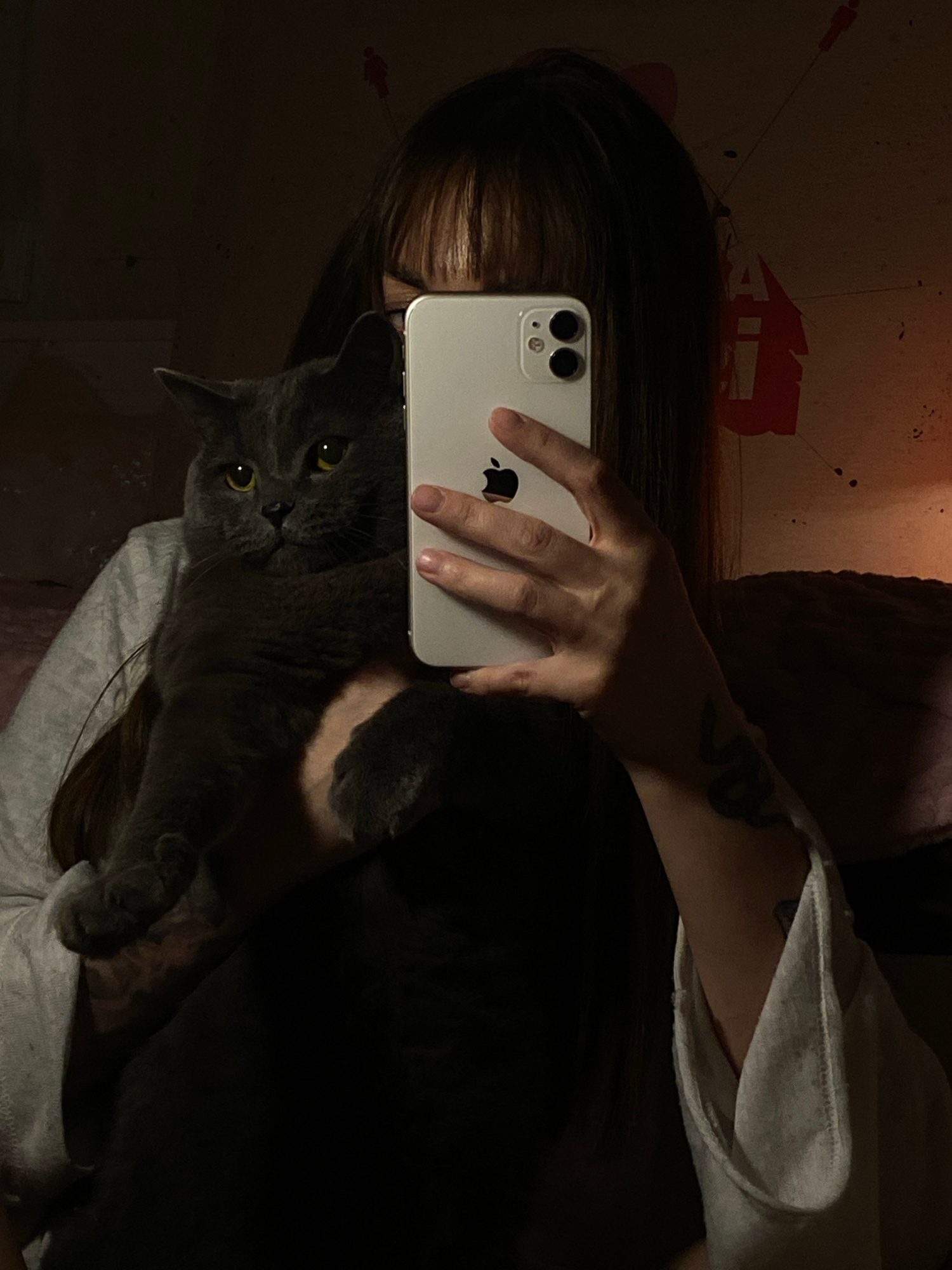 A person with dark hair and bangs holds a white iPhone in front of their face, obscuring it except for the bangs. A dark gray cat with yellow eyes is positioned beneath the phone. The person's hand is…read more