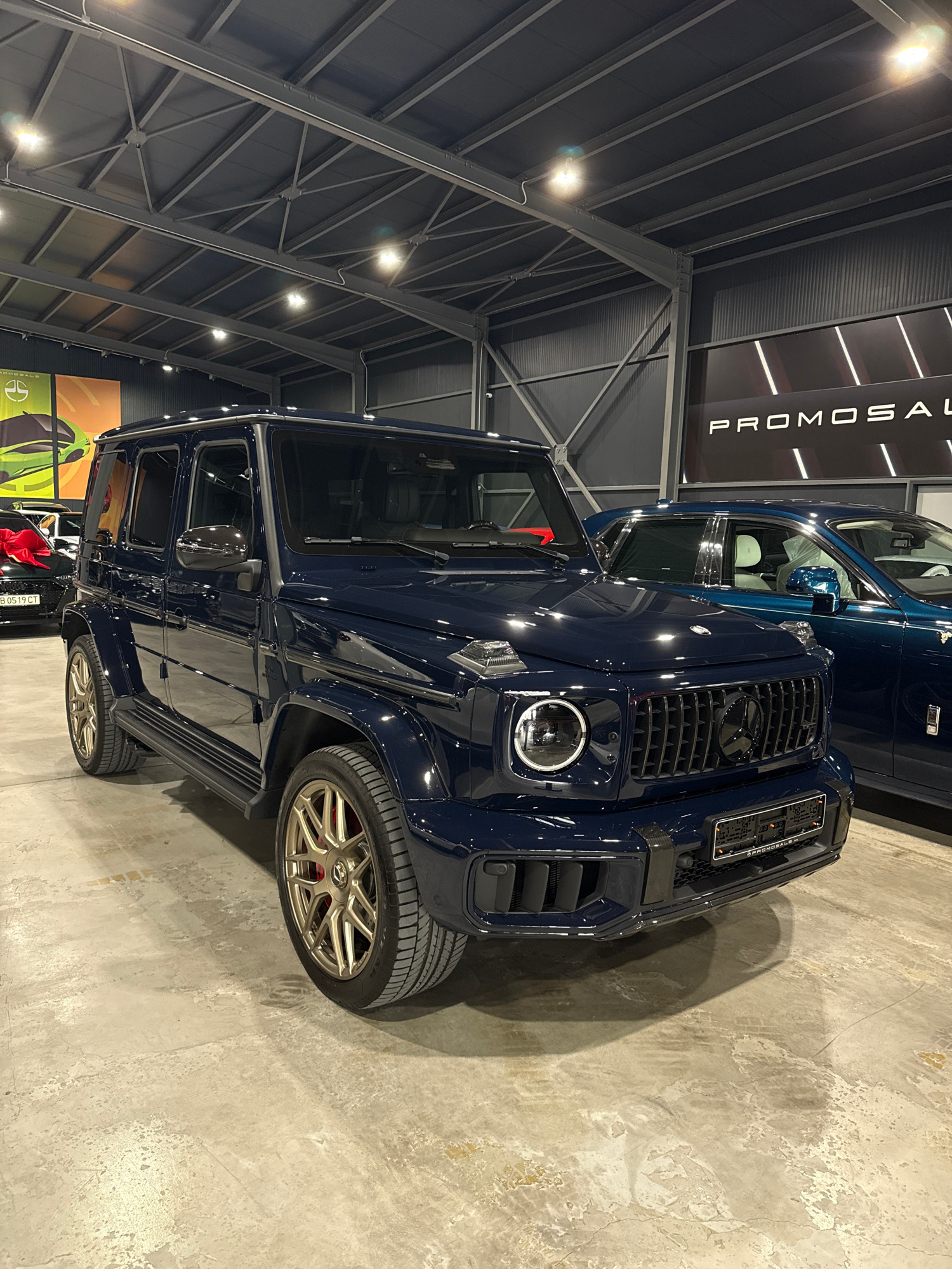 The image shows a dark blue Mercedes-Benz G-Class SUV in an indoor showroom with a concrete floor. The car is parked next to another vehicle, partially visible behind it. A sign reading "PROMOSALE" is…read more