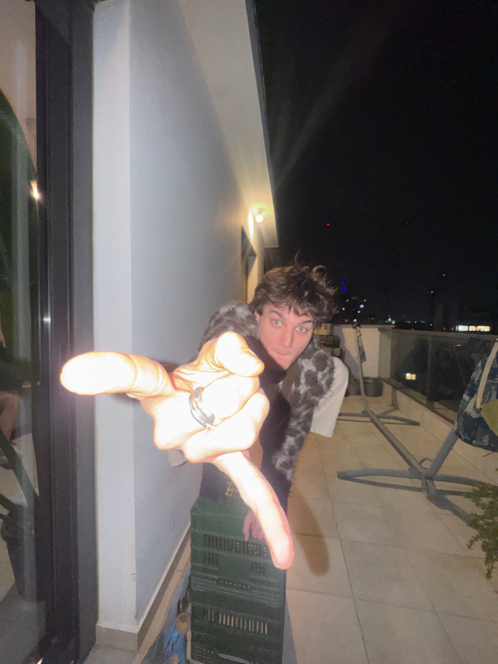From a low angle, a young man poses outdoors at night. He points toward the viewer, his hand close to the camera, adorned with a ring. The background includes a lit building edge and a dark sky dottedβ¦read more