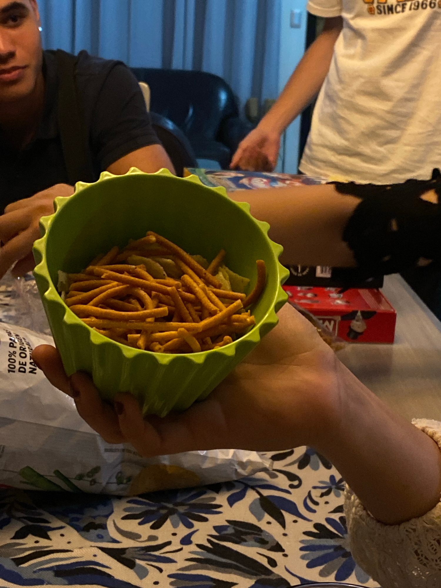 A high-angle shot depicts a person holding a green bowl filled with snacks, likely sticks, against a backdrop including parts of a white t-shirt with lettering, a person's legs and shorts, a red box,…read more