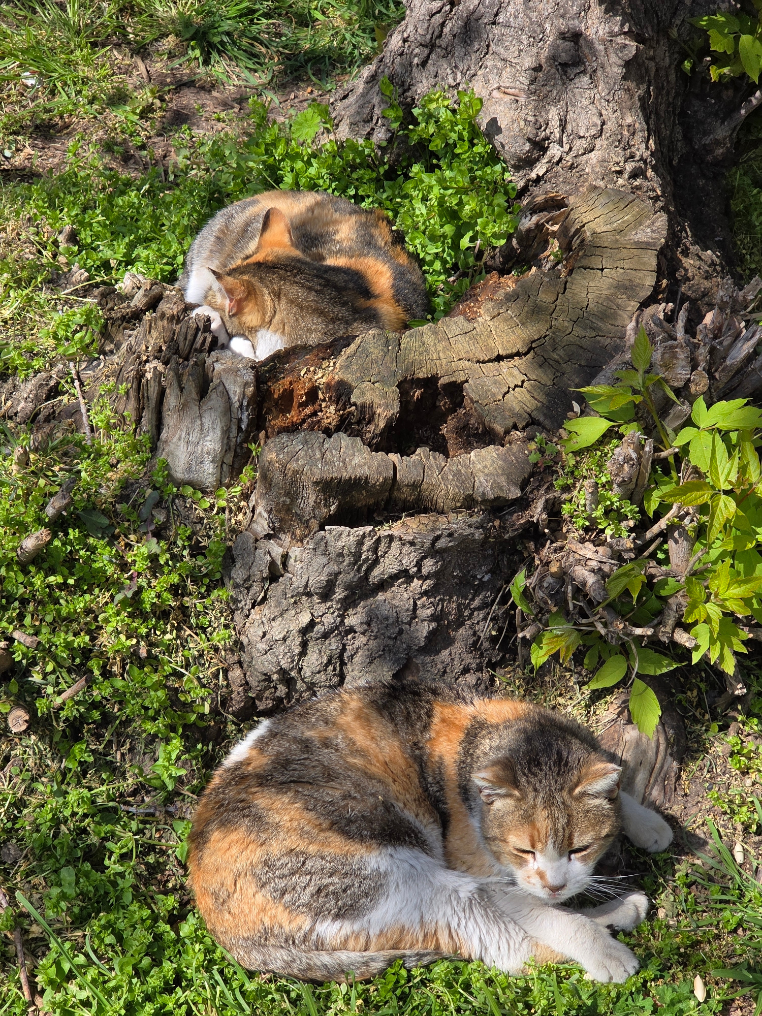Two calico cats are resting outdoors beside and inside of a decaying tree stump. The scene is set on grass. The location appears to be Varna, Bulgaria, but this is an inference as no definitive landma…read more