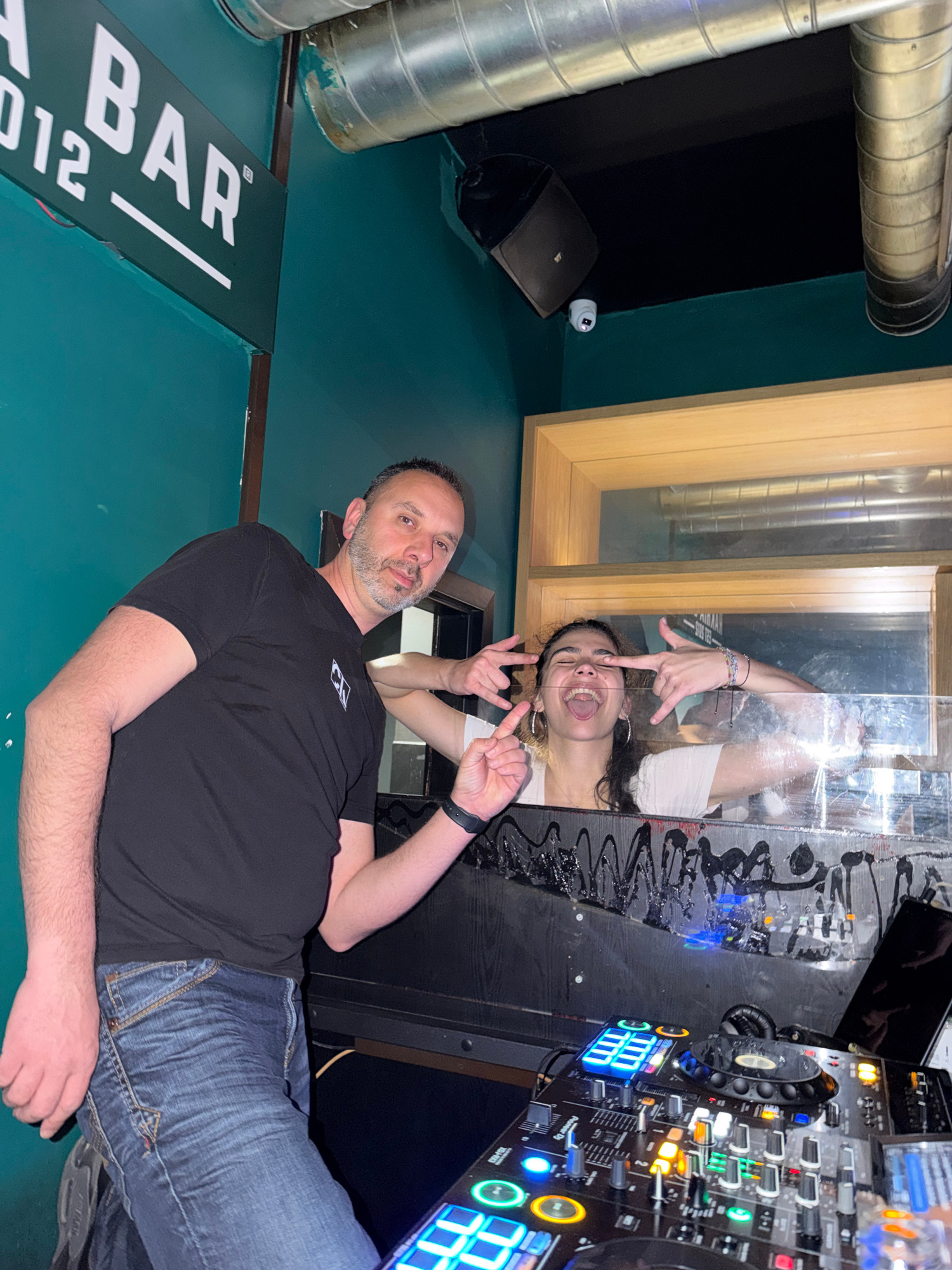 This image depicts an indoor scene at a bar or nightclub, likely during the evening or night in Grad Rijeka, Croatia. In the foreground, a man with a short beard and mustache, wearing a black t-shirt…read more