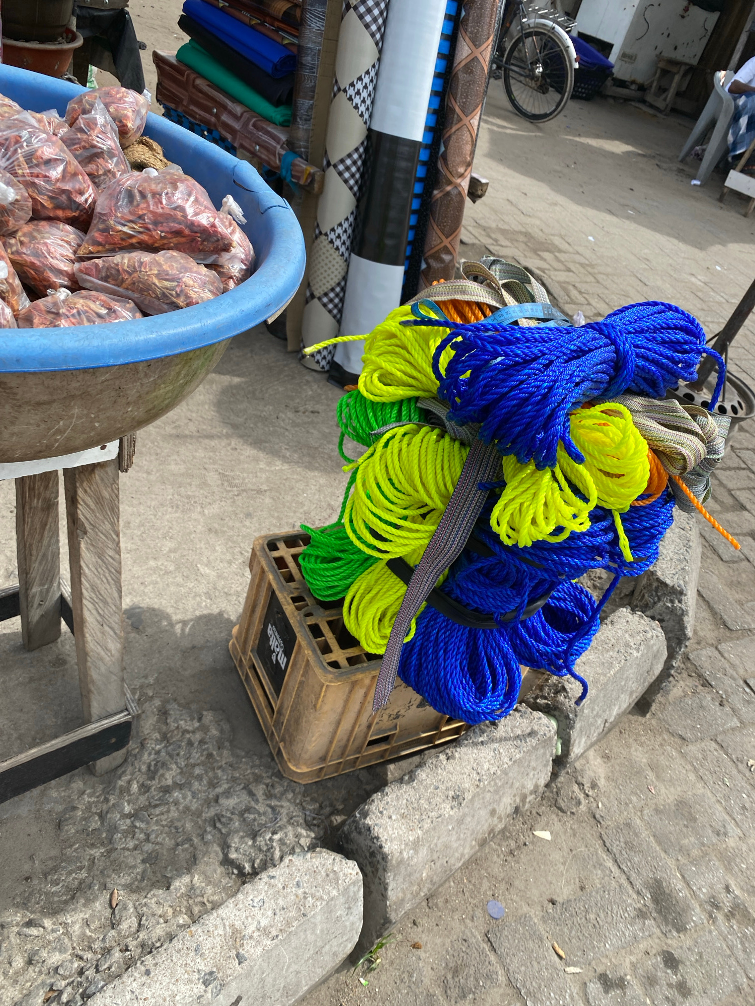 The image shows a street scene in Lekki, Nigeria. The perspective is high, looking down at items for sale displayed on the sidewalk. A light blue plastic tub is filled with clear plastic bags contain…read more