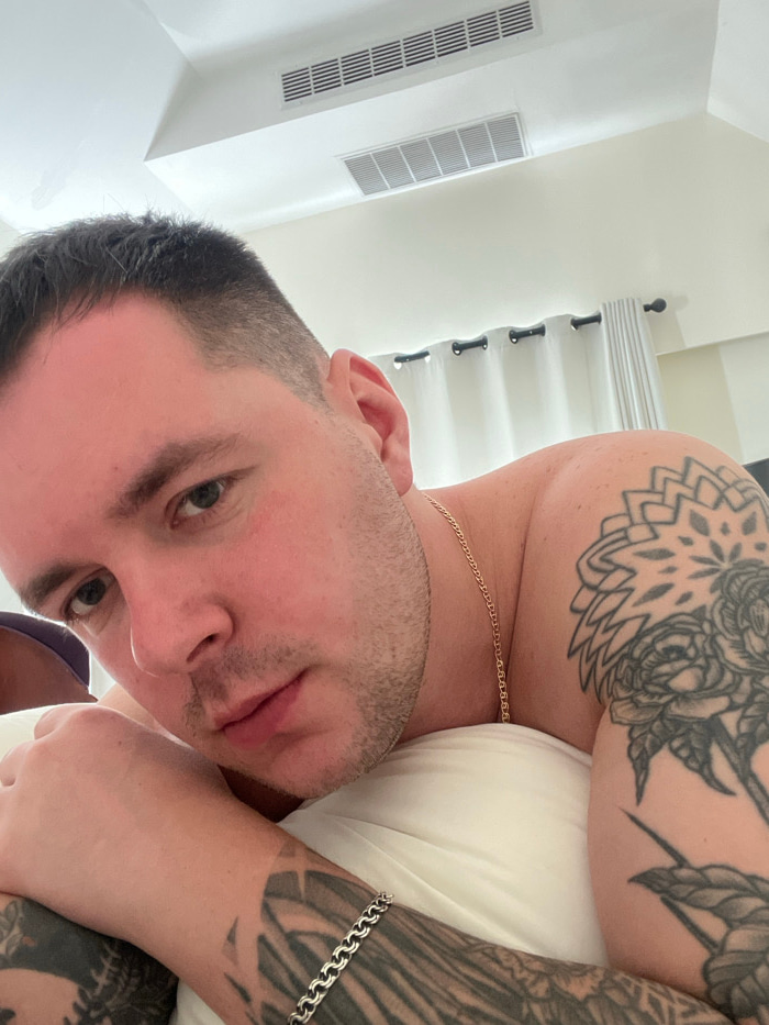 A selfie shows a man lying on a white pillow. He has short brown hair and stubble on his face. The man wears a gold necklace and a silver bracelet. Both shoulders and one arm are visible with intricat…read more