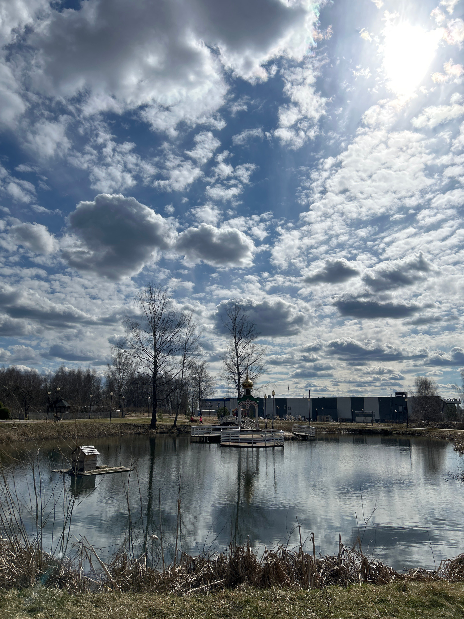 The image depicts a horizontal landscape in Klin, Russia. The foreground features a body of water reflecting the sky's cloud formations. On the right, dry vegetation lines the bank, transitioning to b…read more
