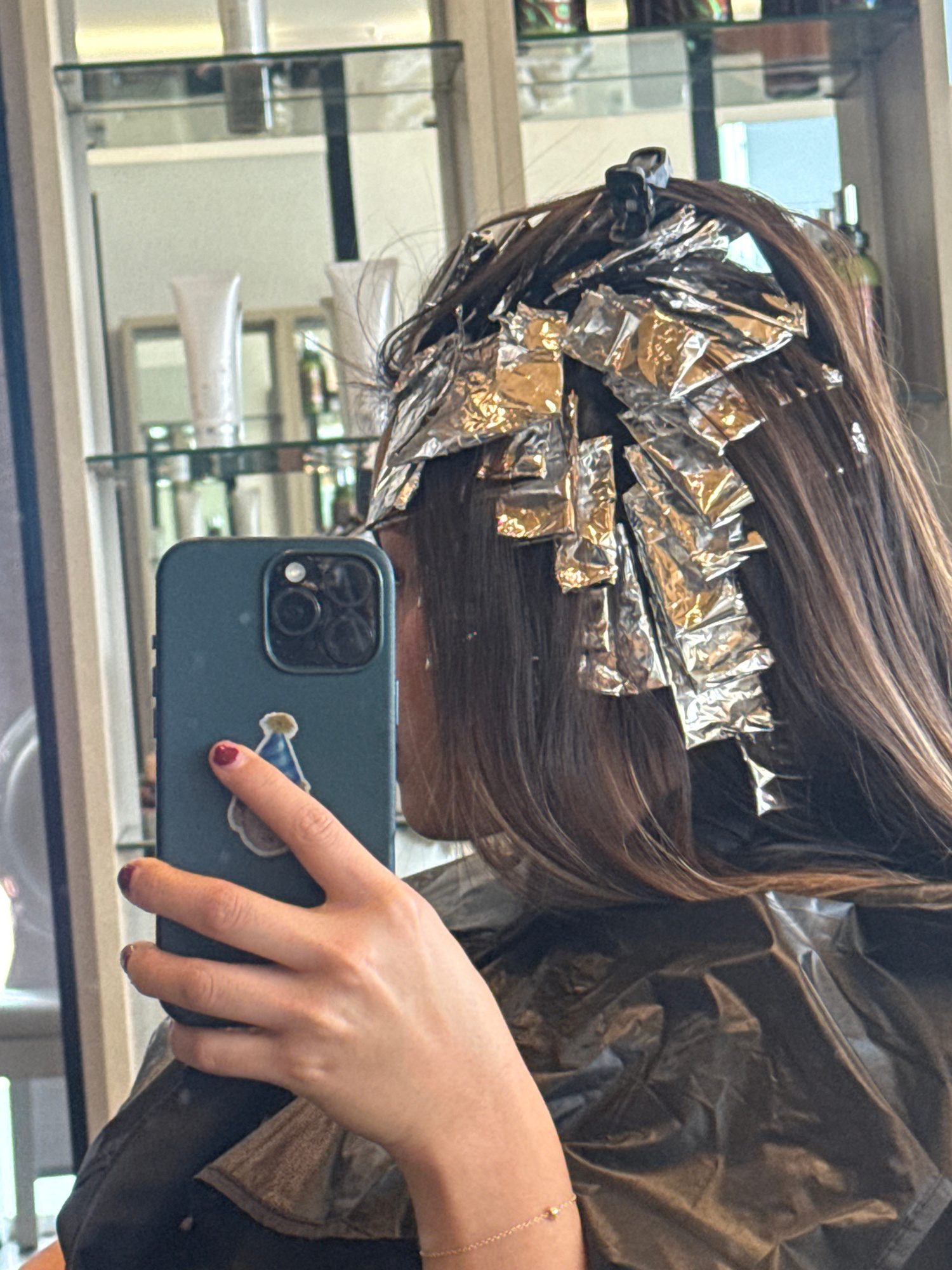 A person with brown hair, partially covered in silver foil highlighting treatments, is taking a selfie in a mirrored salon setting. The individual is wearing a black gown. A blue smartphone with a lig…read more