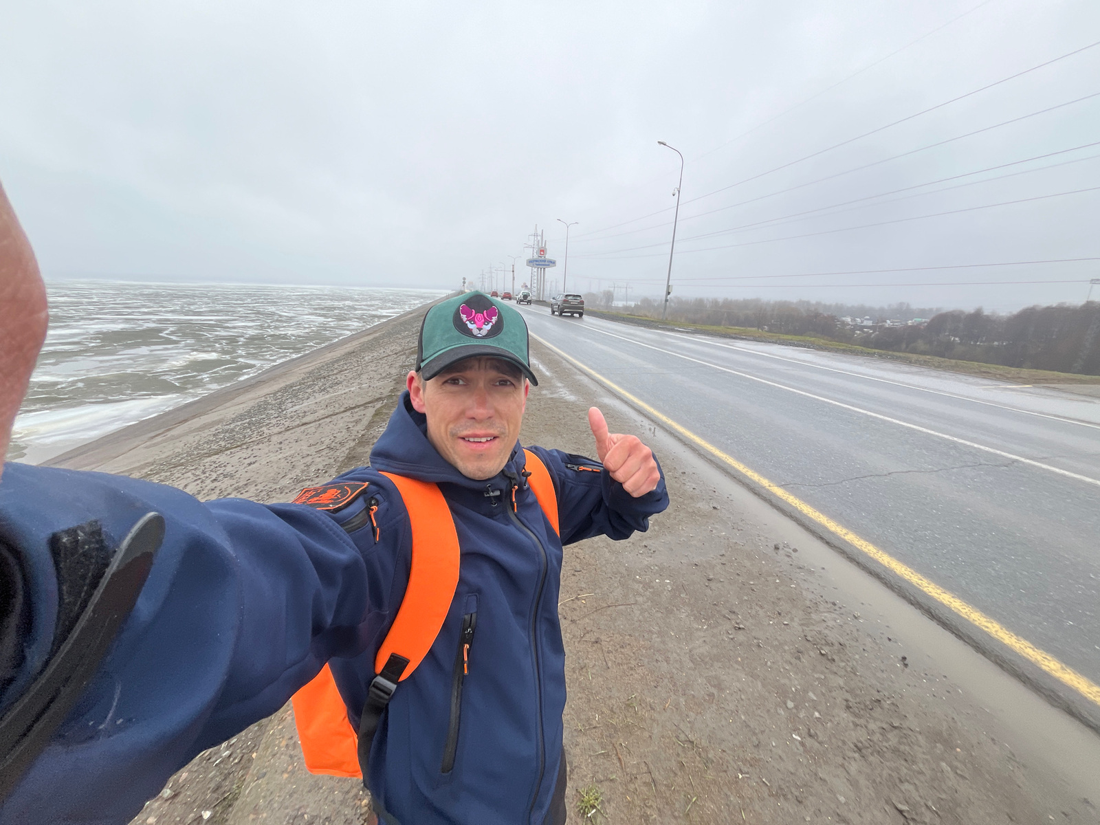 An upright, eye-level selfie shows a man smiling and giving a thumbs-up, standing on the shoulder of a multi-lane road in Noviy, Russia, under an overcast sky. The man is wearing a dark blue and orang…read more