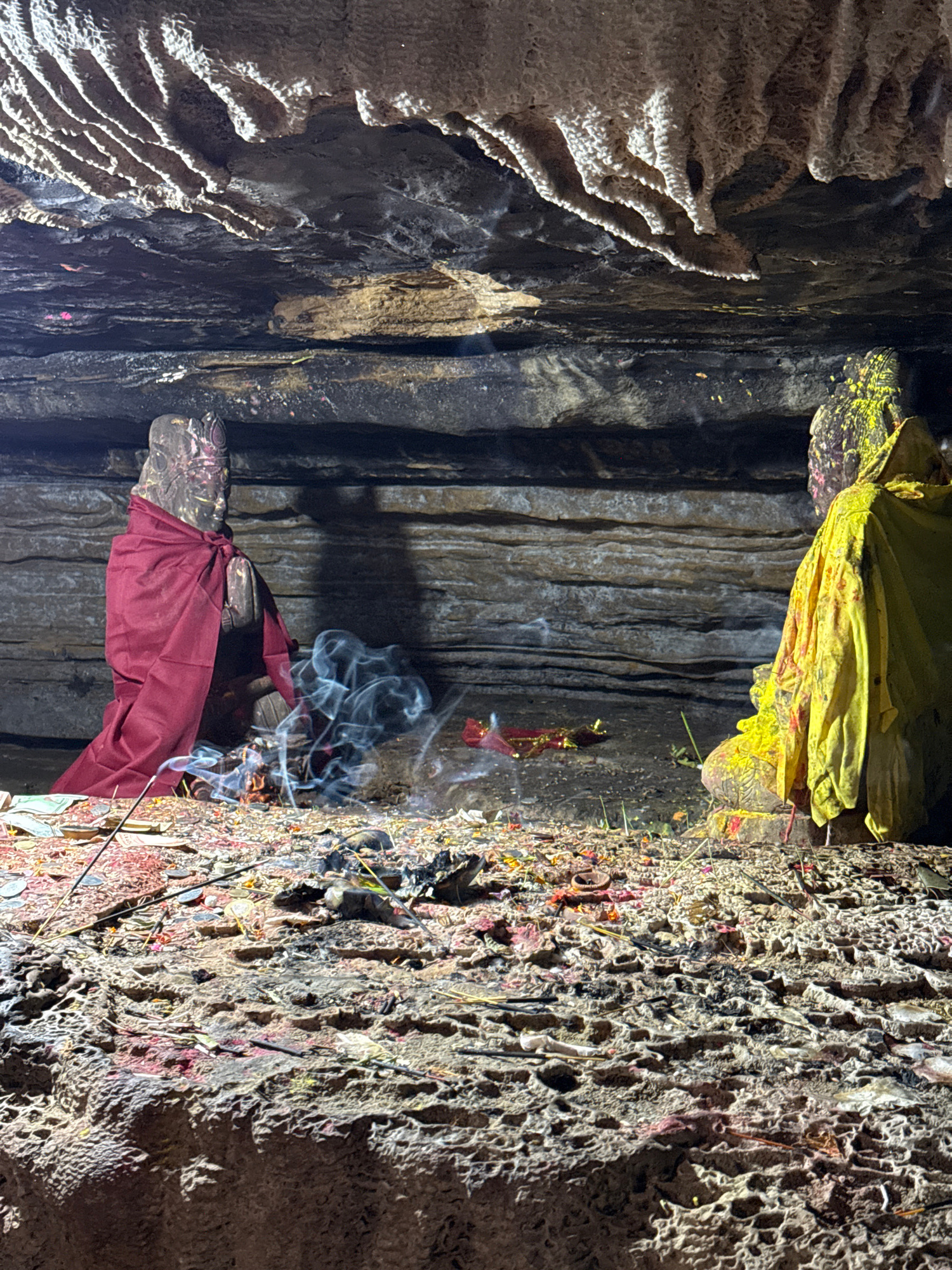 The image captures a scene inside Gupteshwor Mahadev Cave, a Hindu shrine in Pokhara, Nepal. The walls of the cave are jagged, varying in color from light, creamy whites to dark browns and blacks, ind…read more