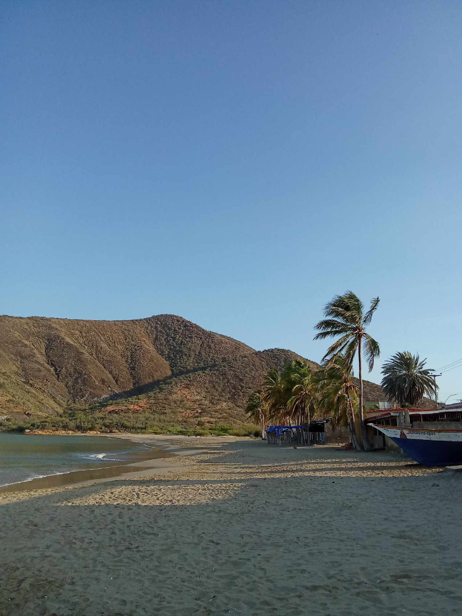 The image shows a beach scene in Juan Griego, Venezuela. A sandy beach occupies the foreground, leading to a small bay with gentle waves. In the background, a large, brown mountain rises. Palm trees a…read more