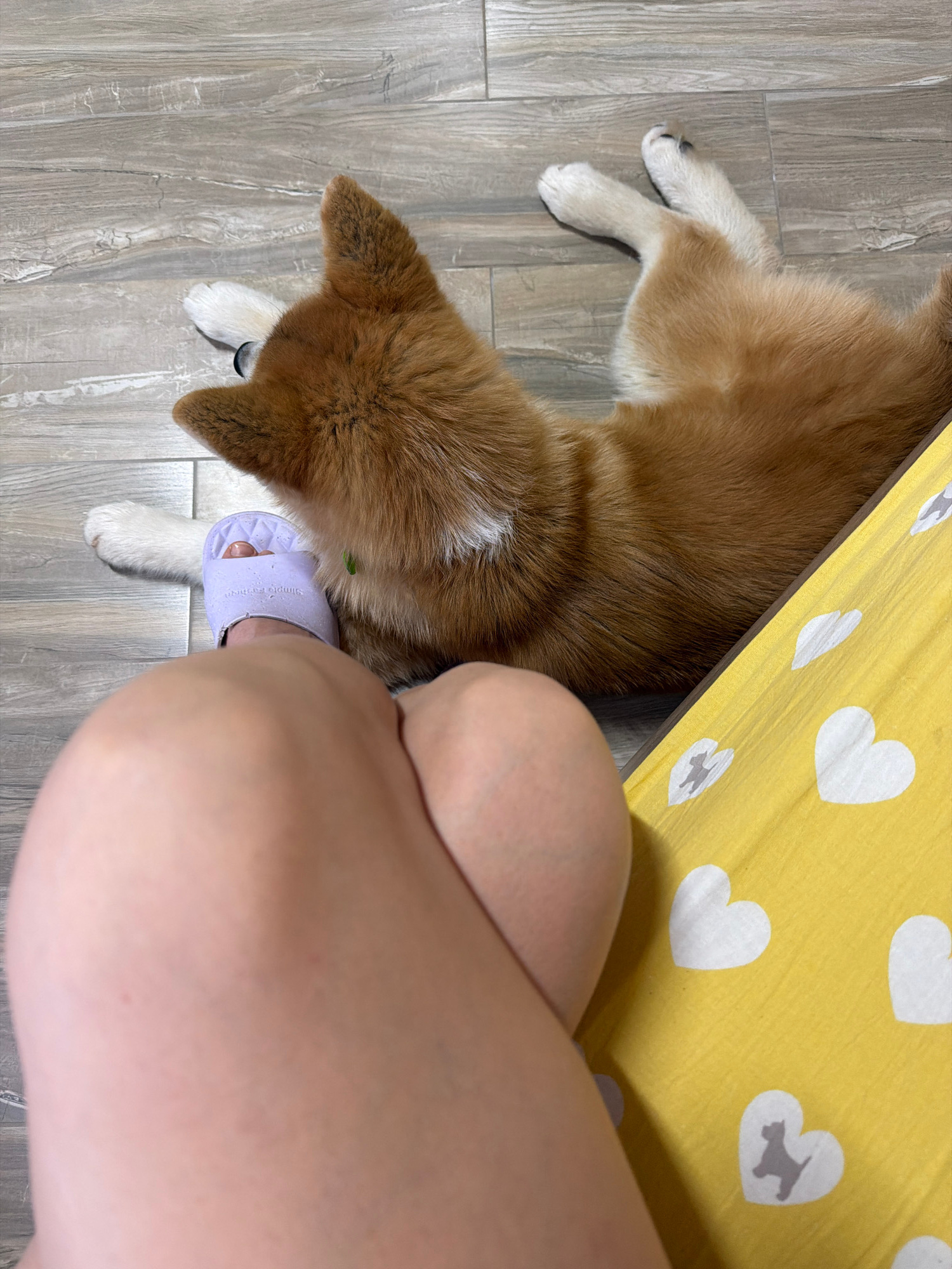 The scene shows a tan and white Akita dog lying on a gray wood-grain floor. The dog is mostly under a yellow blanket with white hearts printed on it, some of which contain a silhouette of a dog. A per…read more