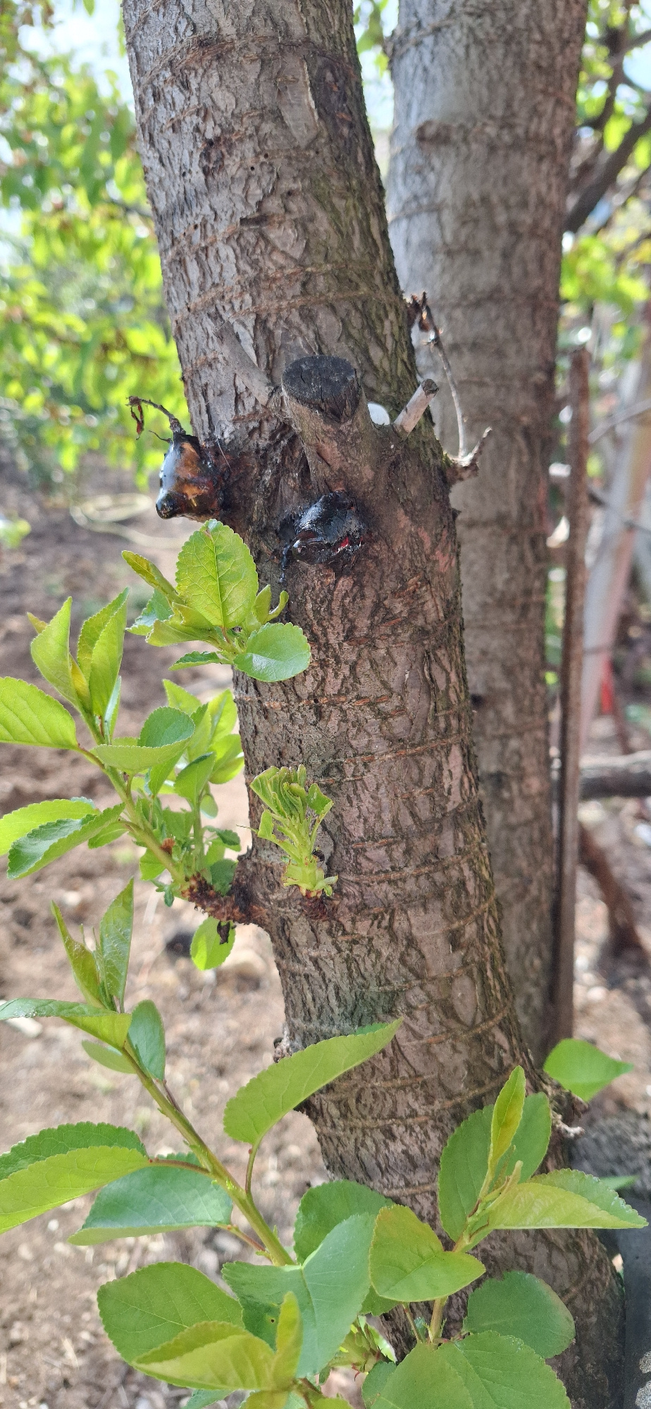 The image shows a tree branch in Katuntsi, Bulgaria. The bark of the branch is textured, with visible cuts and lines. There is sap or resin oozing from a wound on the branch, appearing as a dark, glos…read more