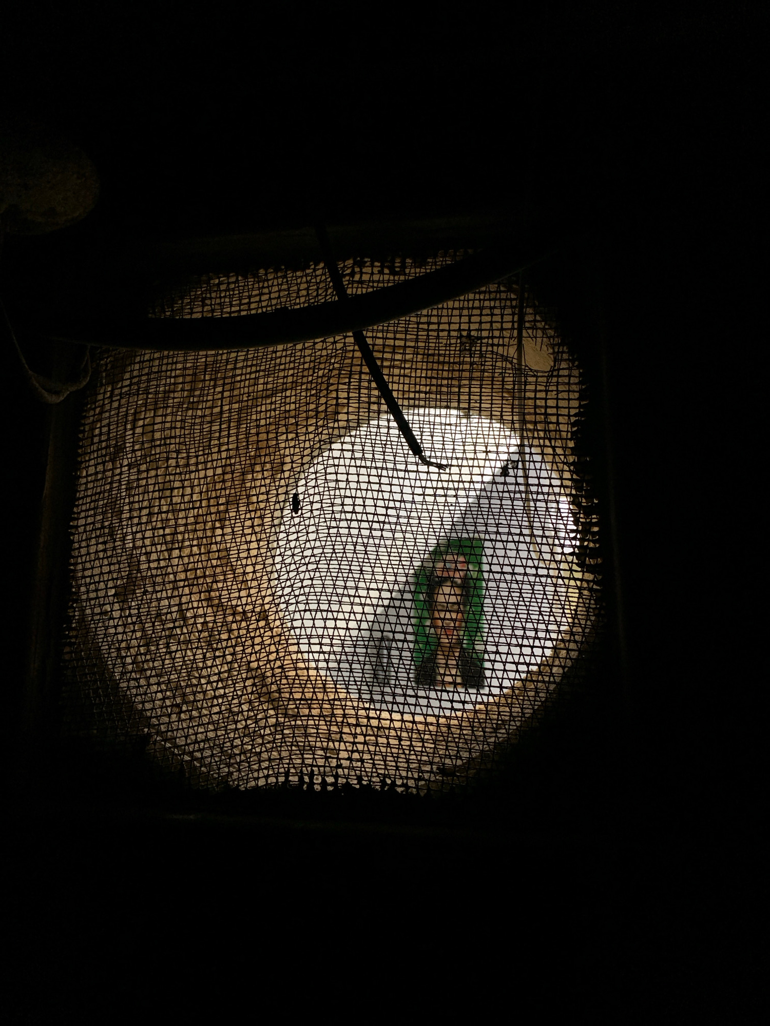 The image depicts a view through a hole in a coarsely woven, damaged screen. A bright, indistinct background is visible through the hole. A glimpse of a green and brown object is seen through the scre…read more