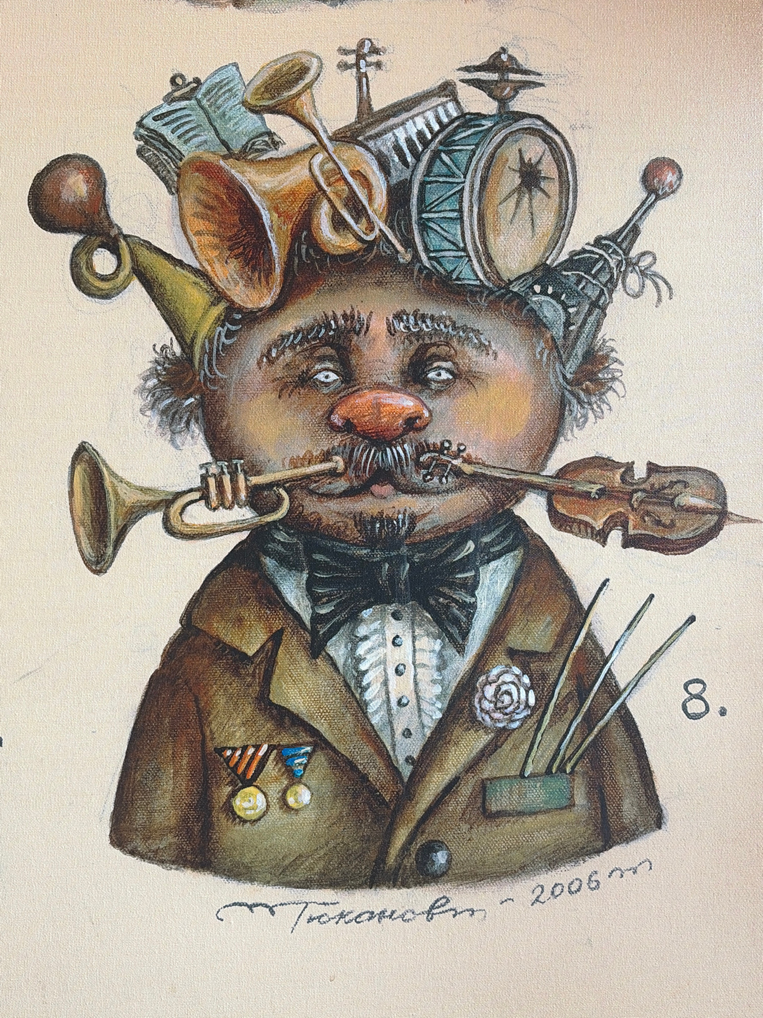 This is an upside-down painting featuring a whimsical character composed of musical instruments. The character has a human-like face with exaggerated features, including a large red nose. Various inst…read more