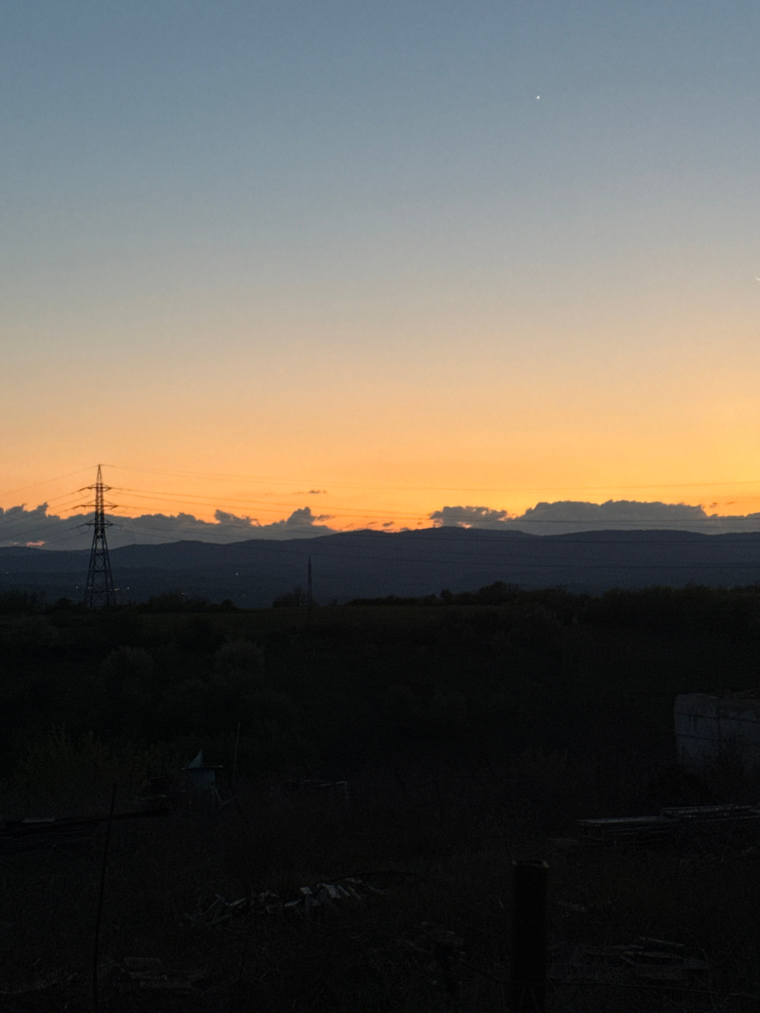 The image shows a vertical view of a sunset or sunrise in a location near Blagoevgrad, Bulgaria. The sky transitions from blue to orange, with silhouettes of mountains or hills in the middle ground. A…read more