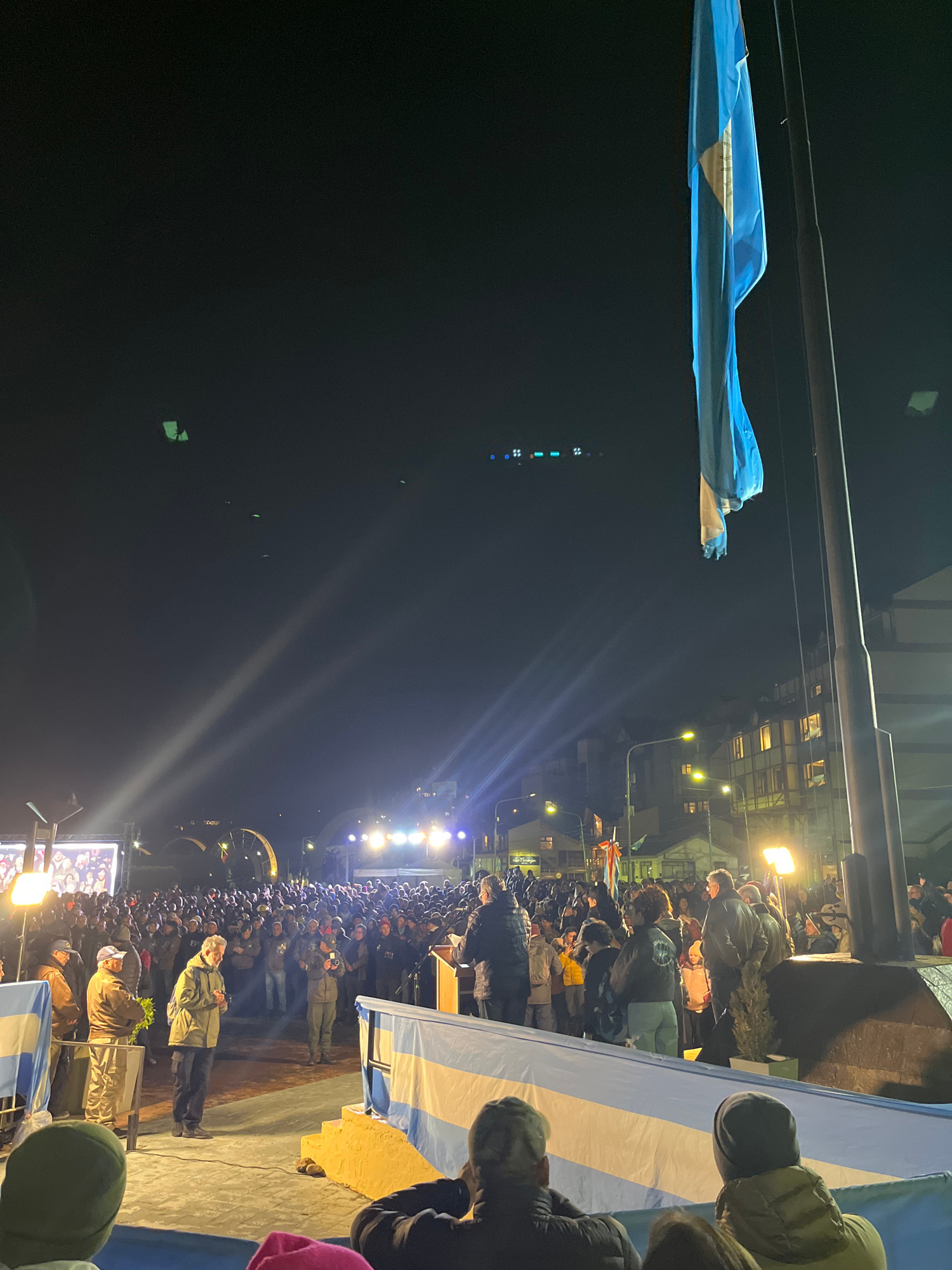 The image captures a nighttime event in what is presumably Ushuaia, Argentina, based on the presence of an Argentinian flag. A crowd of people is gathered in front of a raised platform or stage, whichβ¦read more