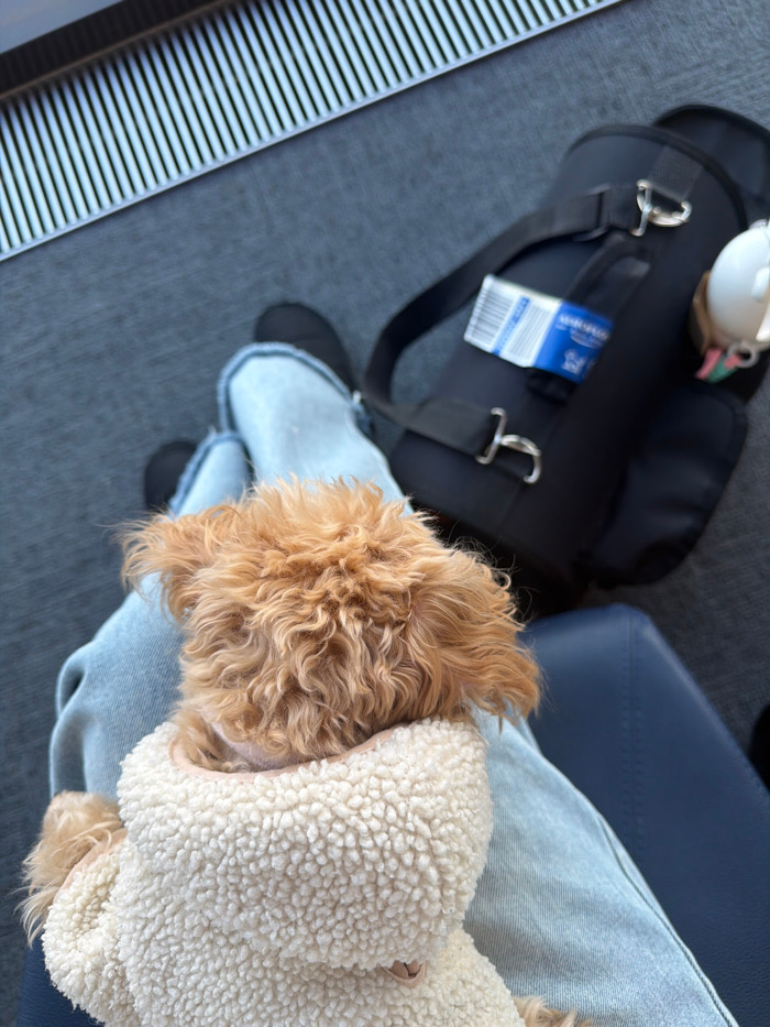 A seated individual, wearing light blue jeans and black shoes, is viewed from a first-person overhead perspective in an indoor public space in Khimki, Russia, likely a waiting area. Their left leg is…read more