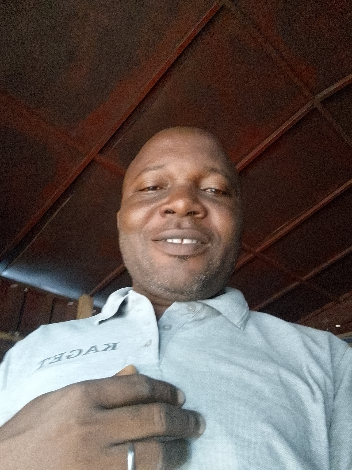 A smiling man is featured in a close-up, likely a selfie, looking directly at the camera. He is bald and has short stubble or a trimmed beard, revealing his upper teeth as he smiles. He is wearing a l…read more