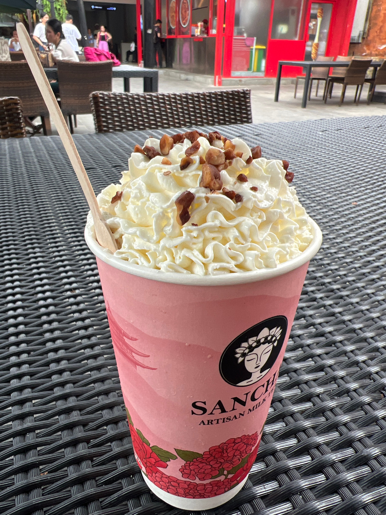 The image presents a large cup of what appears to be a milk-based drink with whipped cream and nuts on top, set on a black wicker table. A wooden spoon is inserted into the drink. The cup is pink, ado…read more