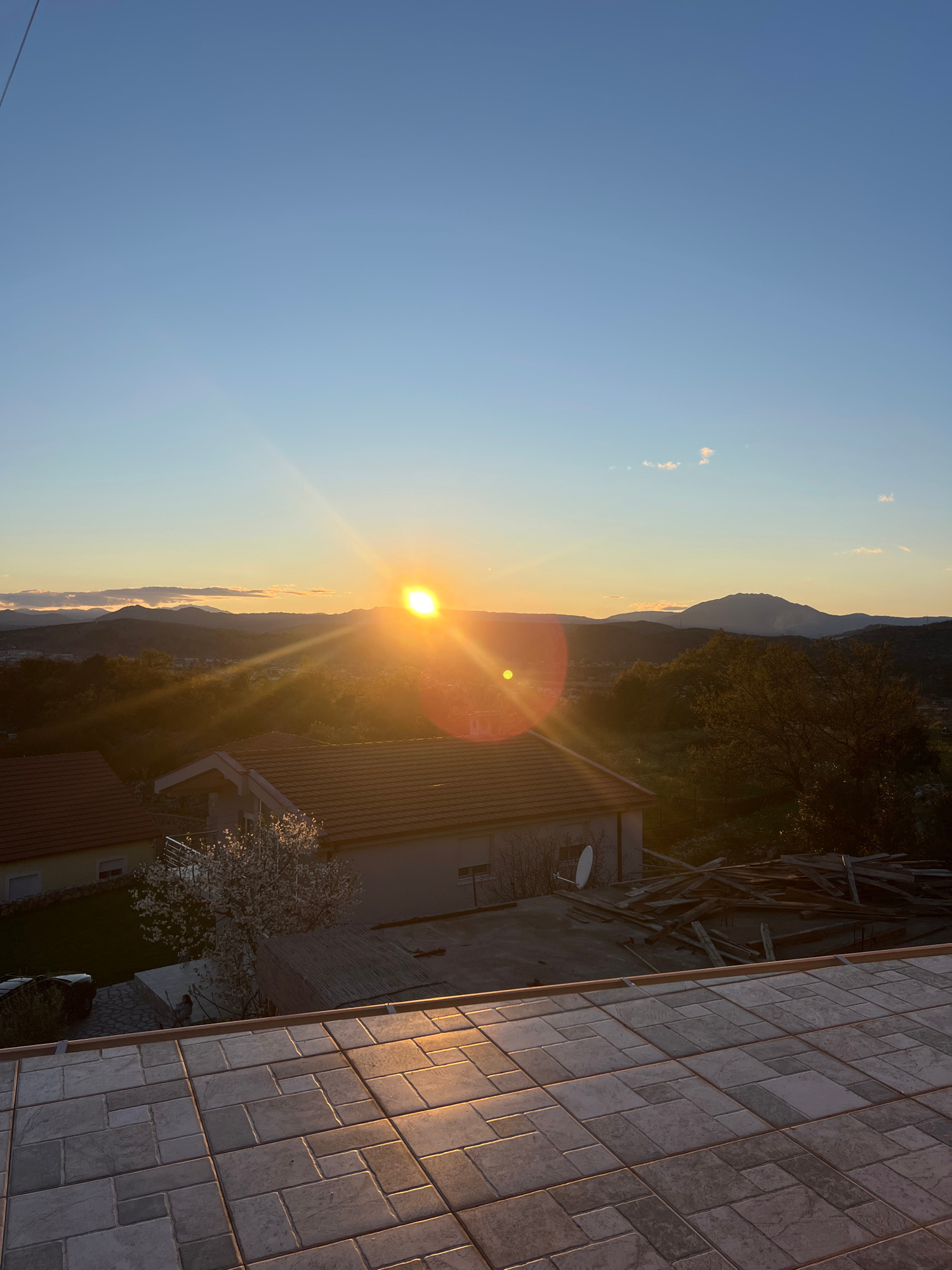 The image shows a sunset scene in Podgorica, Montenegro. The sun is setting behind a mountain range, casting a golden glow over the landscape. A building with a tiled exterior is in the foreground. A…read more
